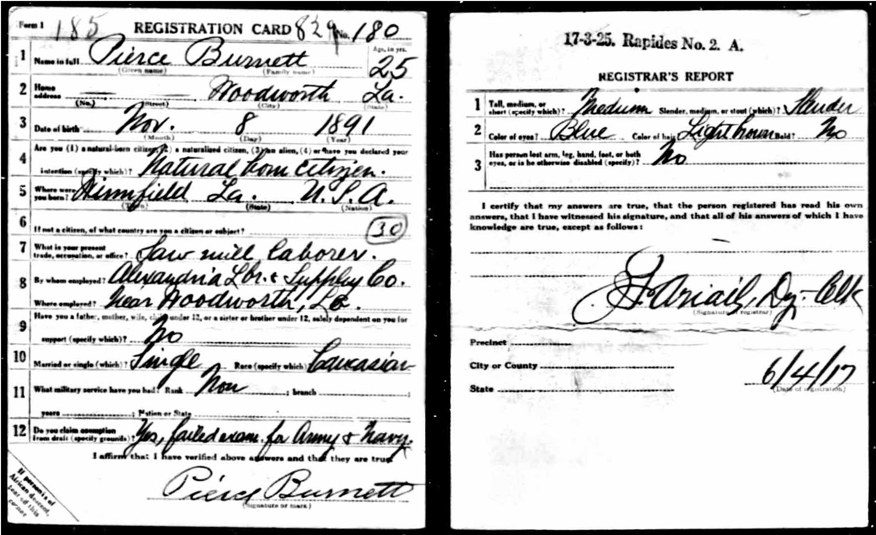 June 1917 in Woodworth, Louisiana; Saw Mill Laborer - Alexandria Lumber and Supply Company