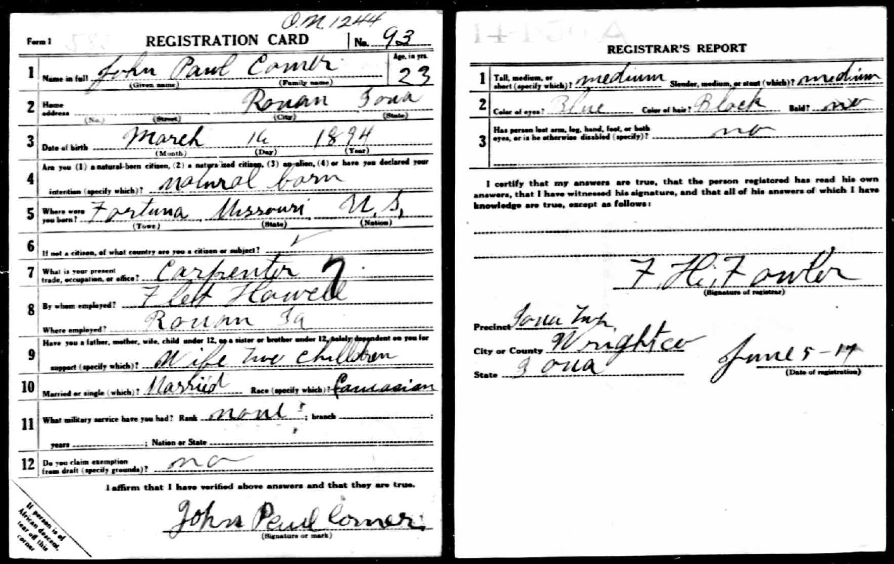 June 1917 in Rowan, Iowa; Carpenter
