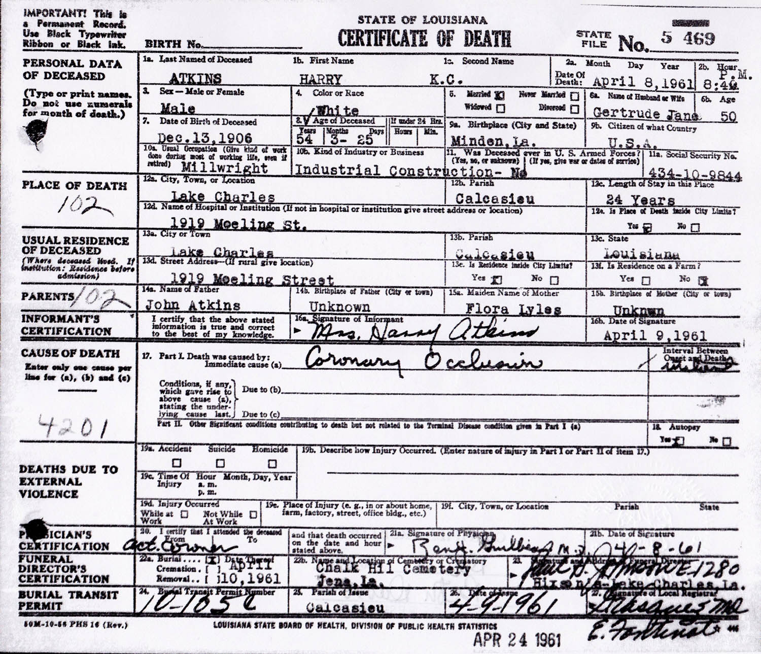 December 11, 1959 in Lake Charles, Louisiana; Graceland Cemetery - Section O, Lot 3 - Toward the back - Across the street from the flag pole and under a tree.