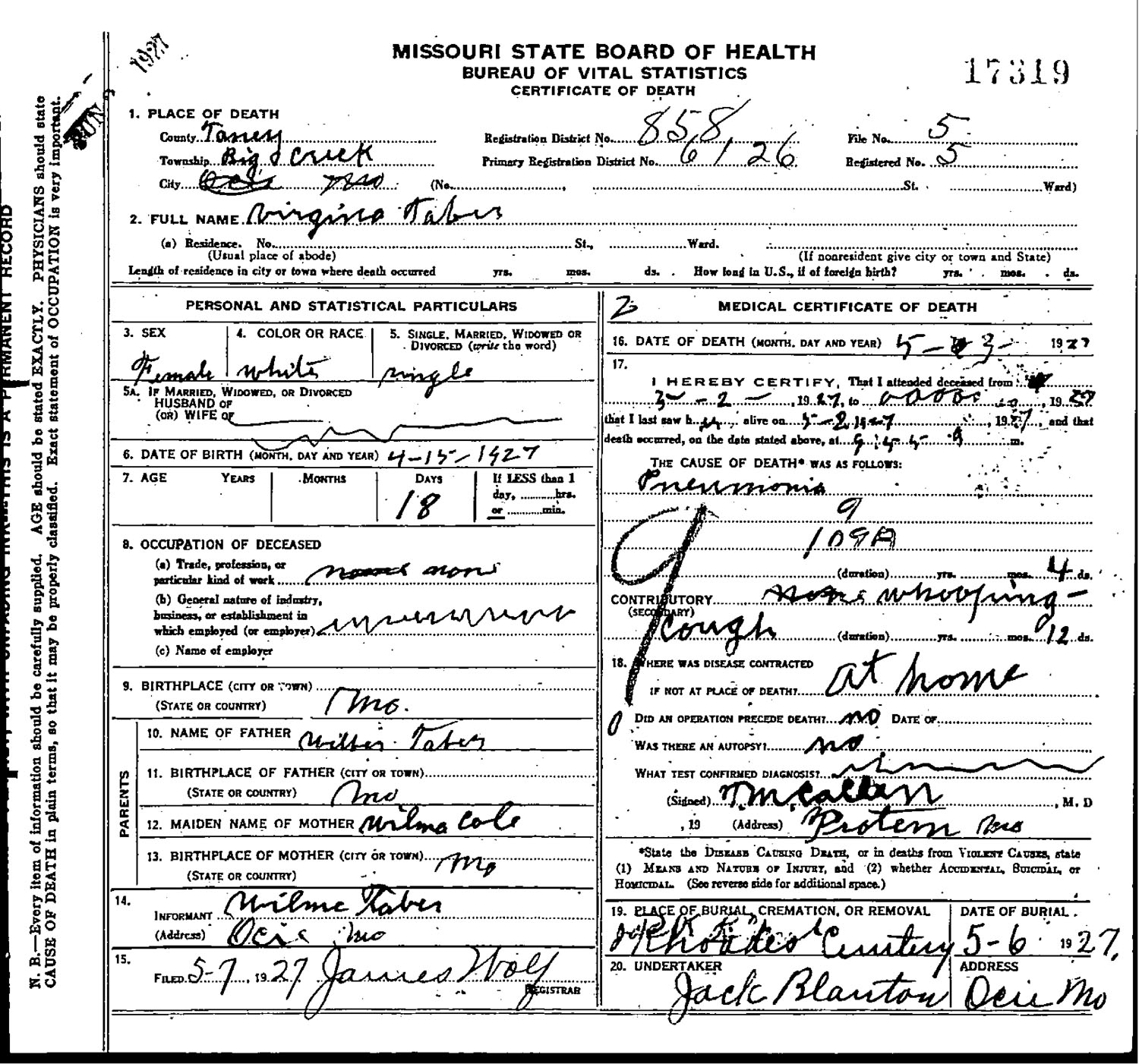 May 1927 in Ocie, Missouri