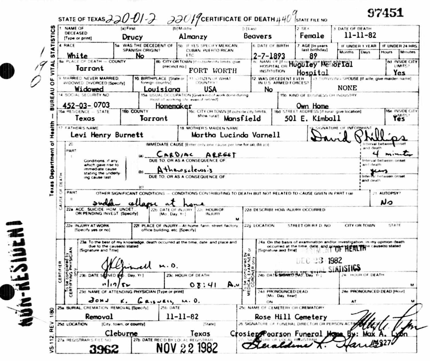 November 15, 1982 in Cleburne, Texas; RoseHill Cemetery