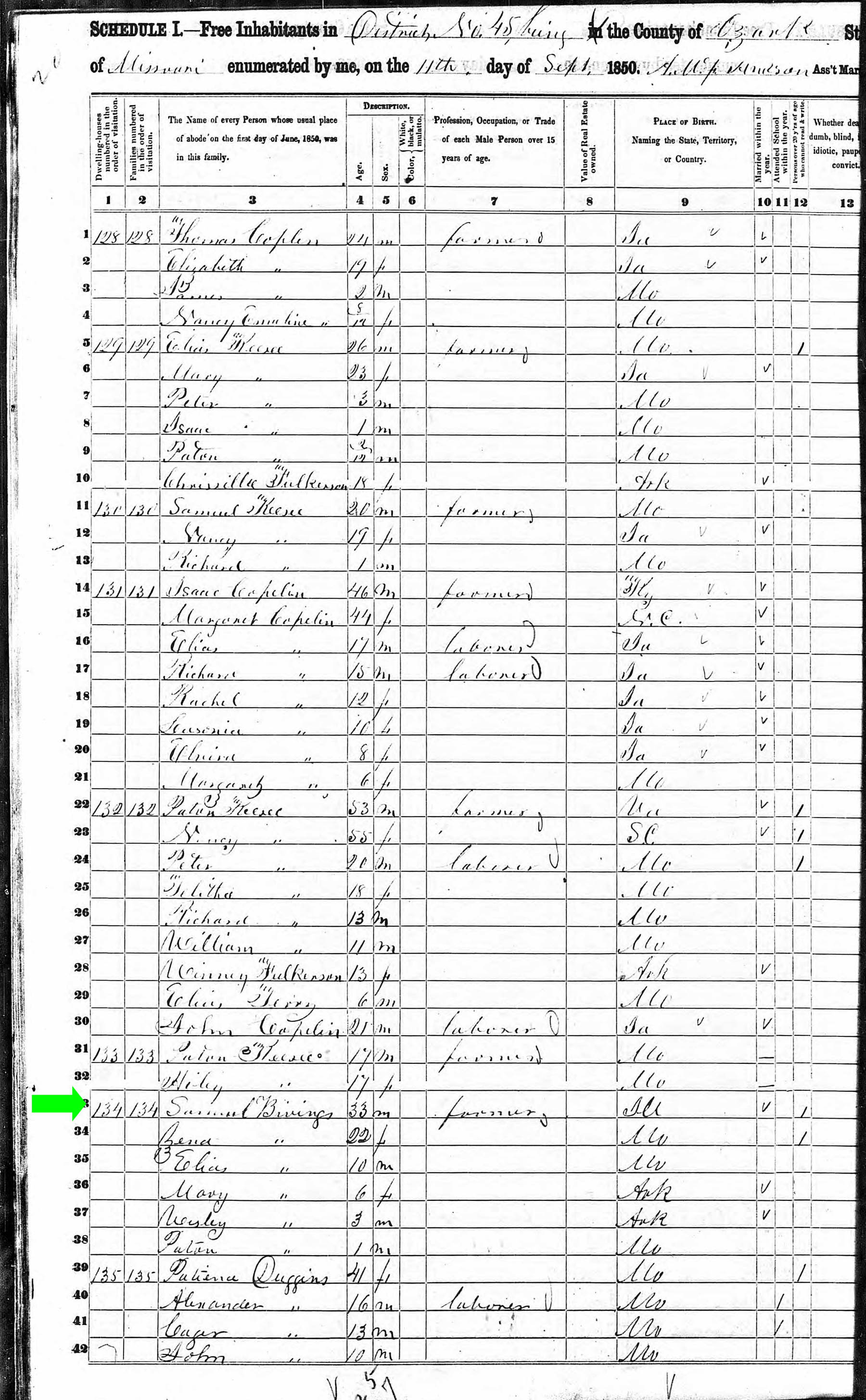 Sepember 1850 in Ozark Co., Missouri