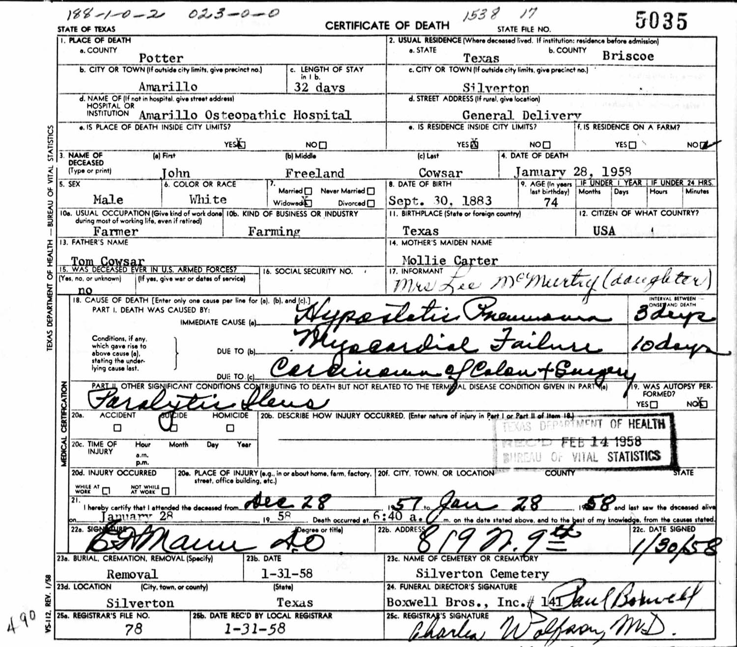 January 31, 1958 in Silverton, Texas; Silverton Cemetery