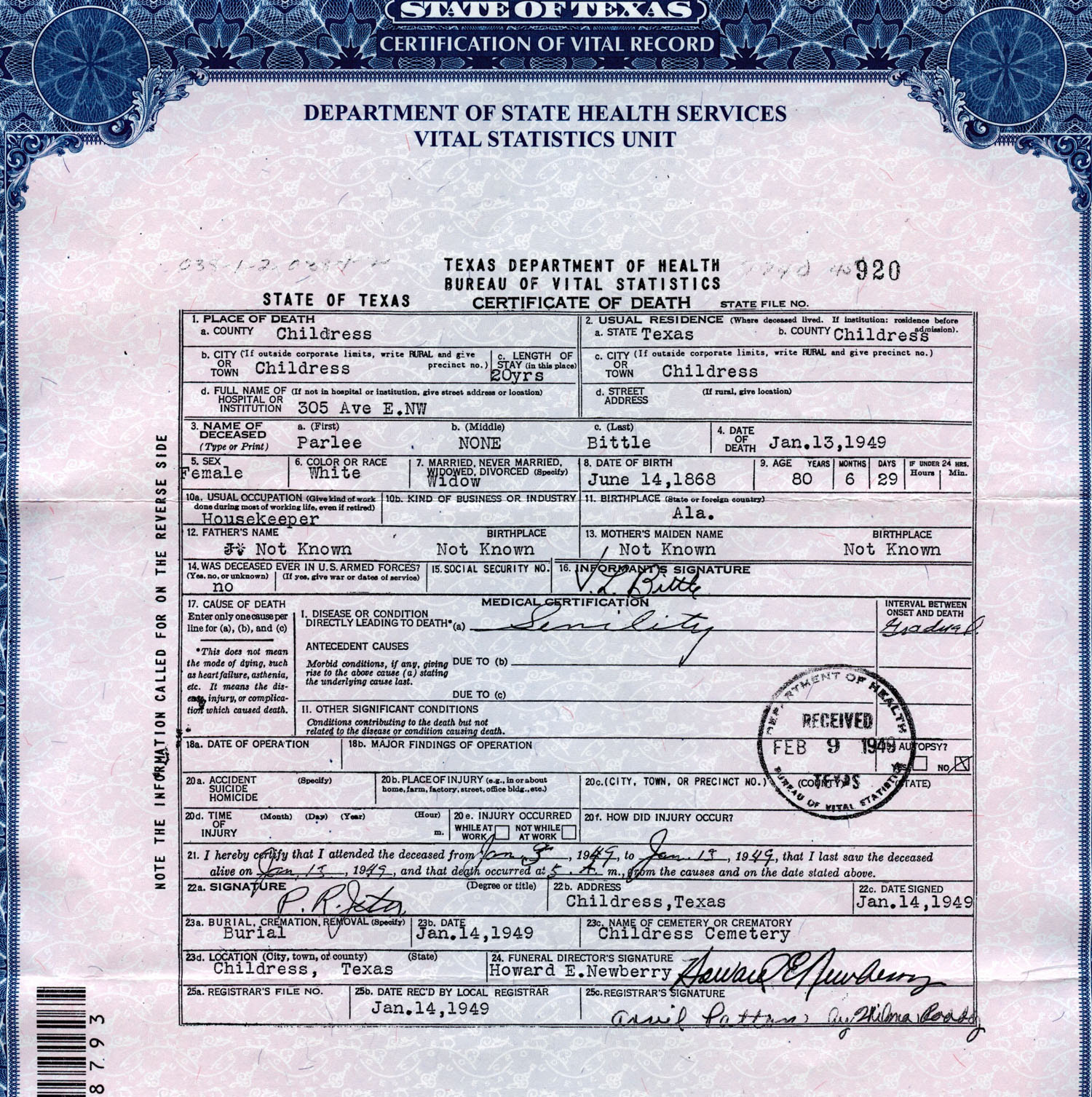 January 14, 1949 in Childress, Texas; Funeral Director - Howard E. Newberry
