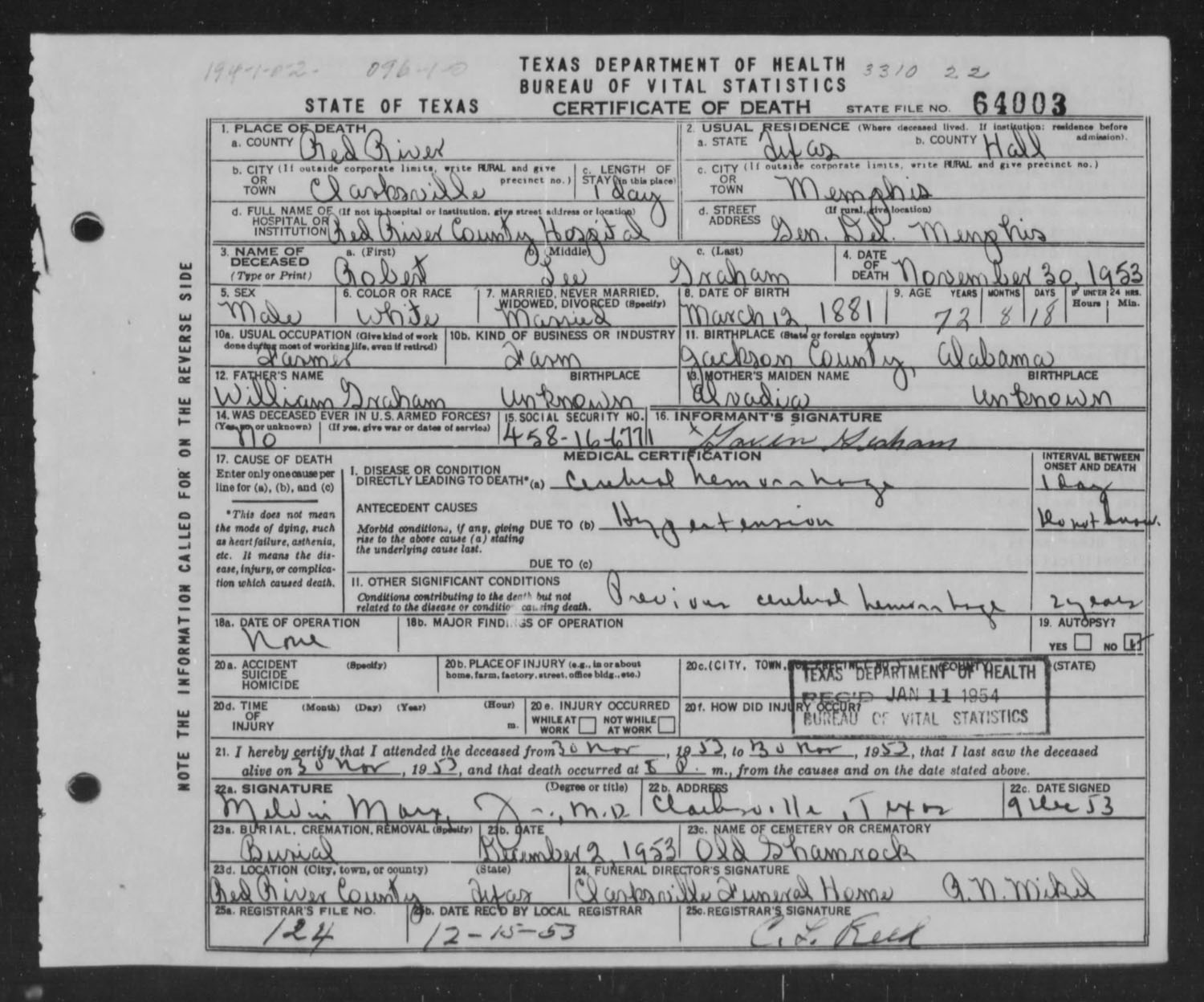 August 28, 1925 in Clarksville, Texas; Old Shamrock Cemetery