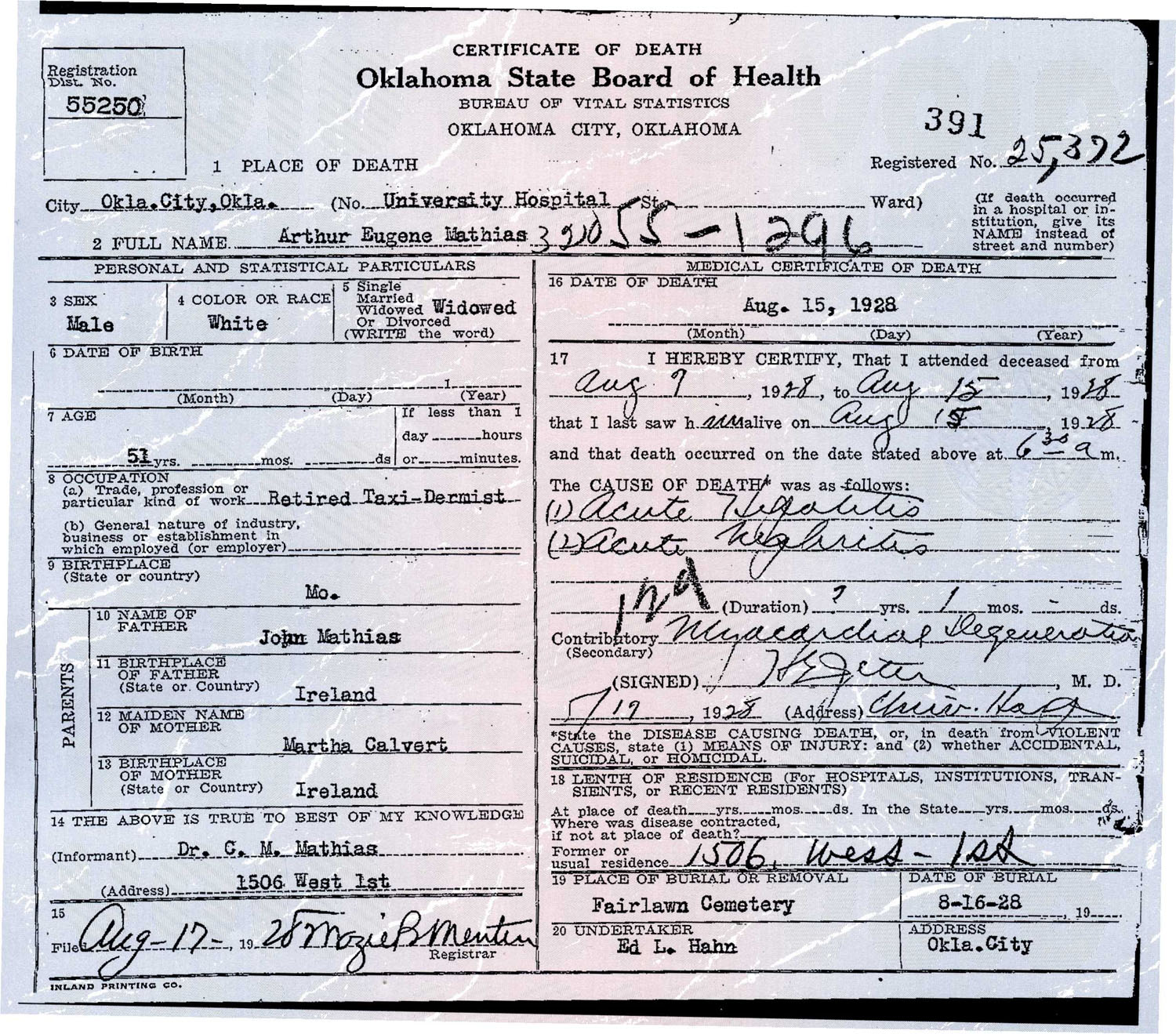August 16, 1928 in Oklahoma City, Oklahoma; Fairlawn Cemetery - Section 4, Row 12, Grave 9 (up against the fence)