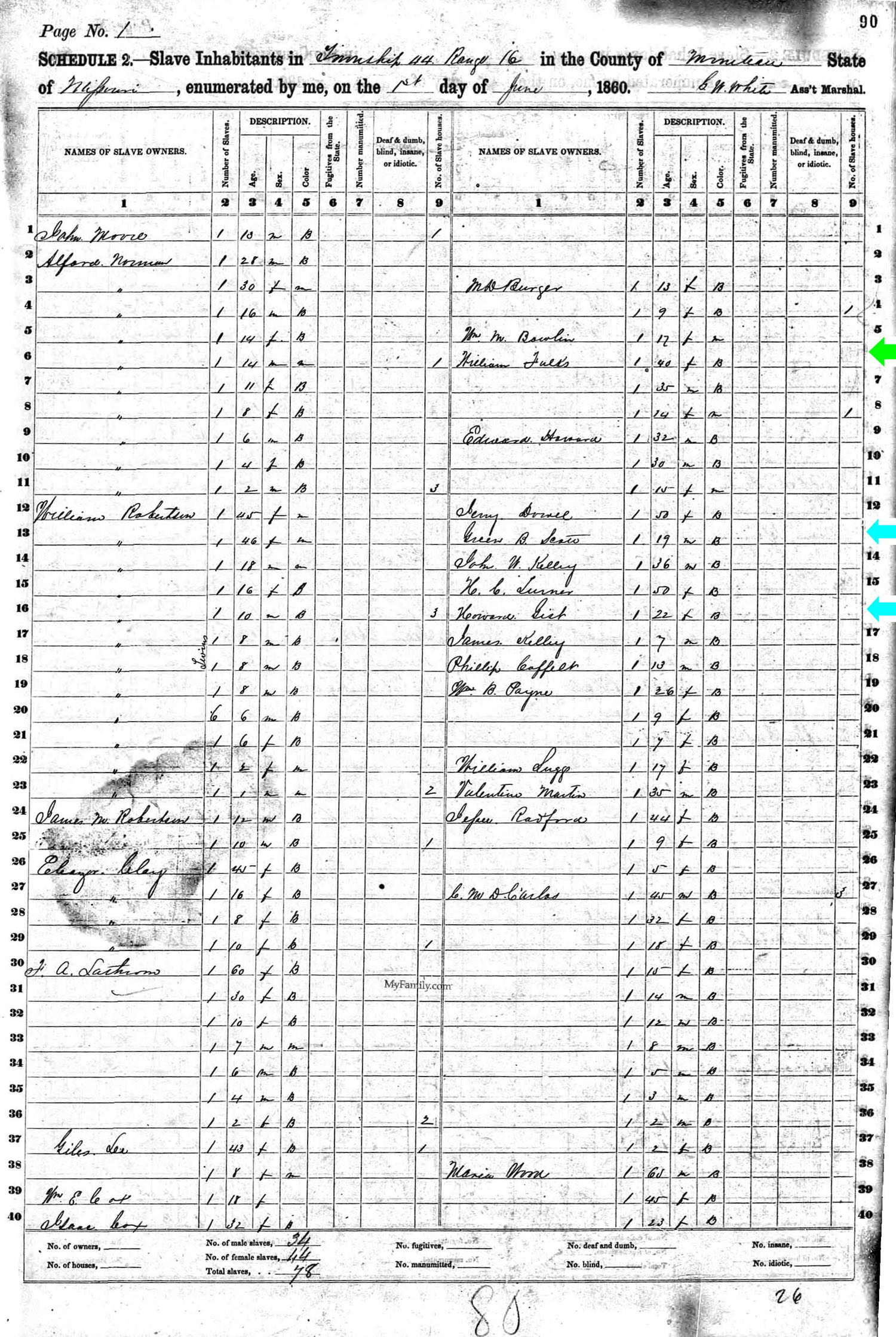 June 1860; 3 Slaves - 1 Male (age 35) - 2 Females (Ages 40 & 14)