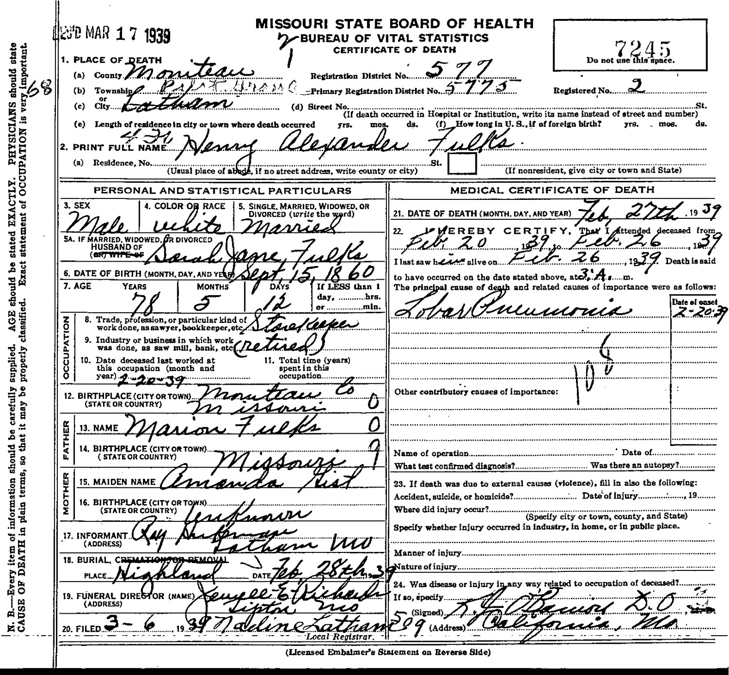 June 12, 1919 in Latham, Missouri; Latham Cemetery