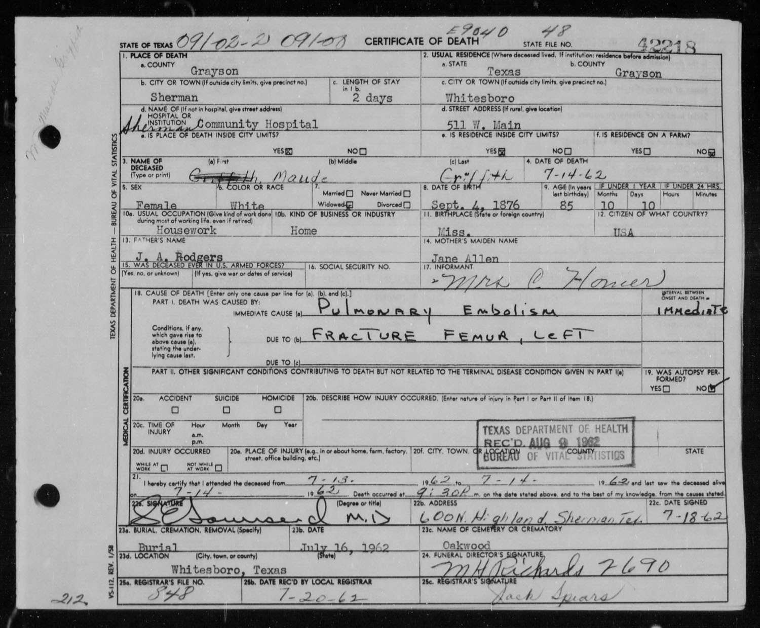 July 16, 1962 in Whitesboro, Texas; Richards-Beck Funeral Chapel