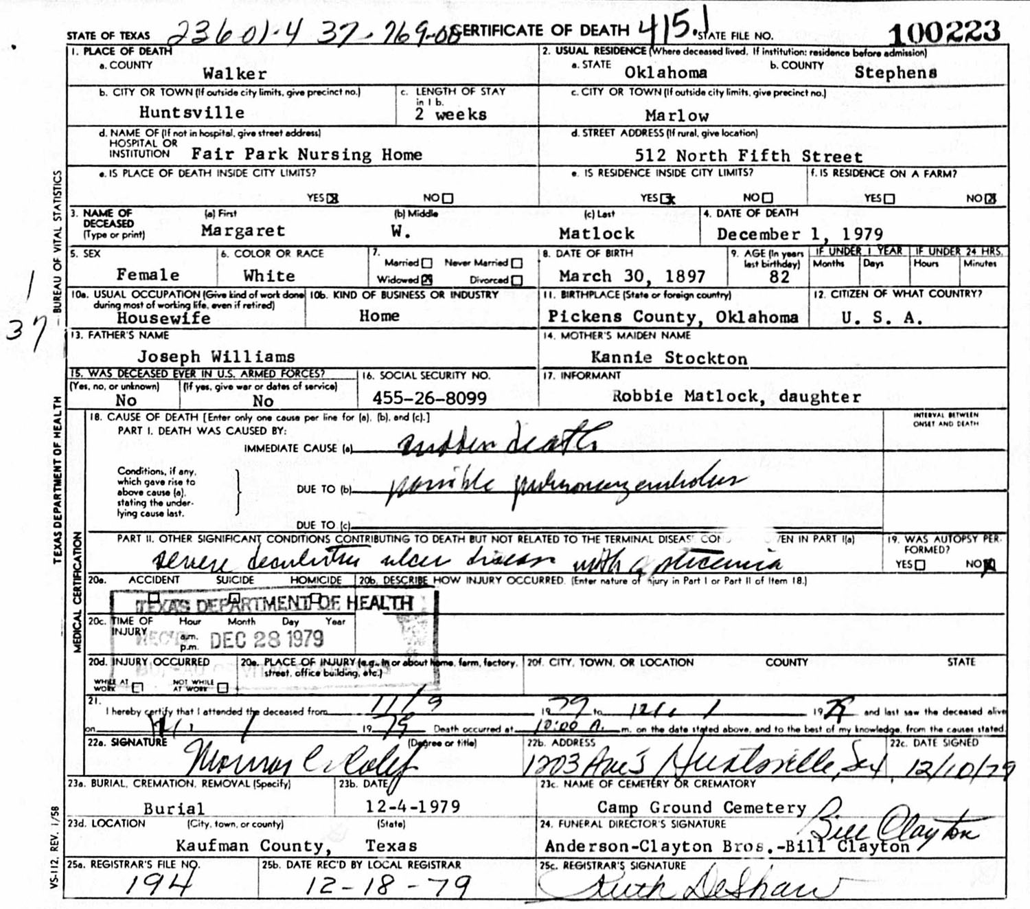 About 1926; 25 Jan 1927 in Marlow, Stephens, Oklahoma