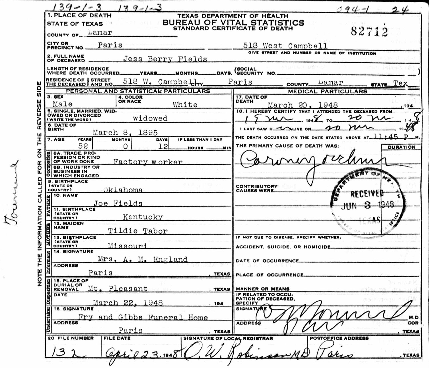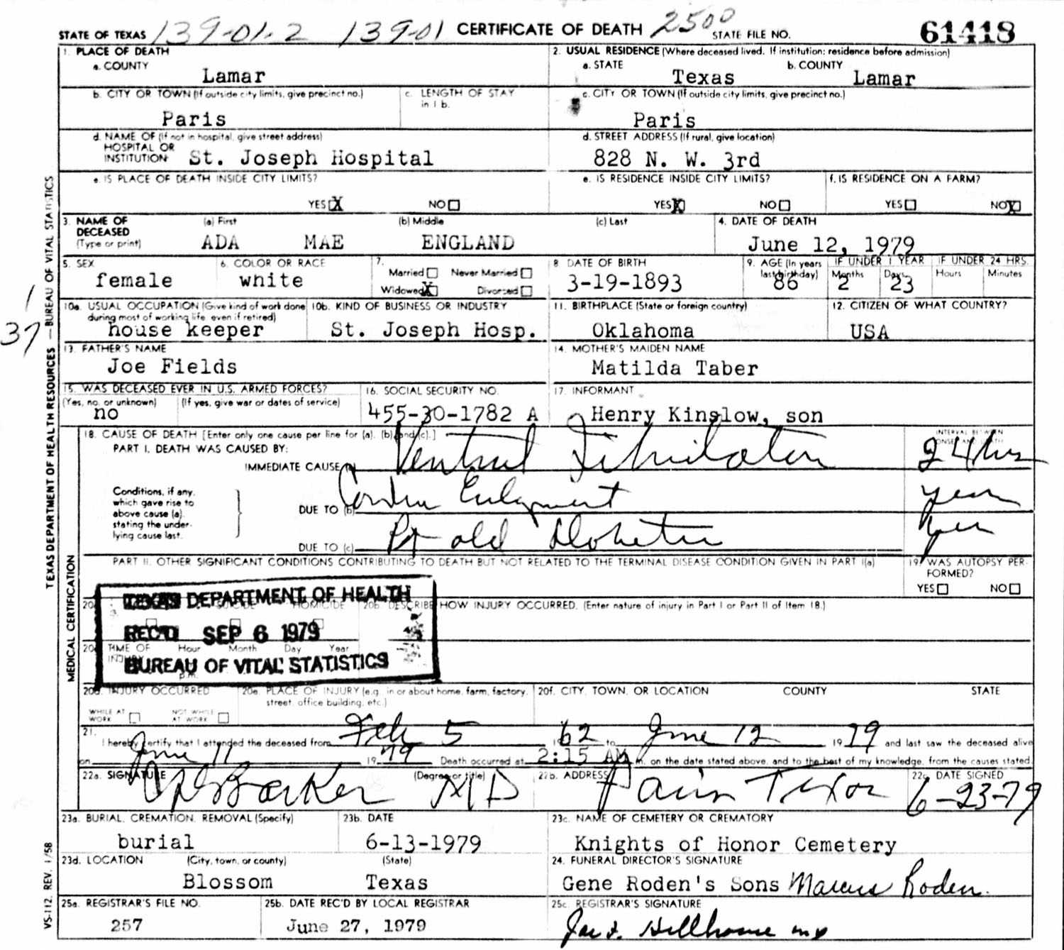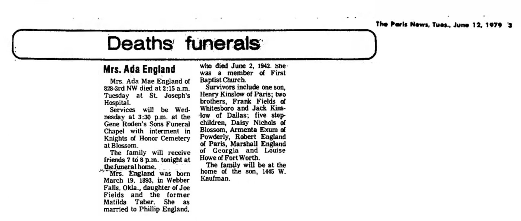 May 28, 1935 in Blossom, Texas; Knights Of Honor Cemetery