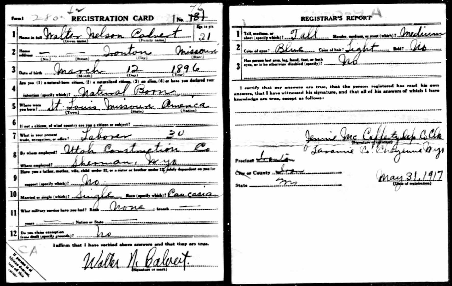 May 1917 in Sherman, Wyoming; Laborer - Construction Company