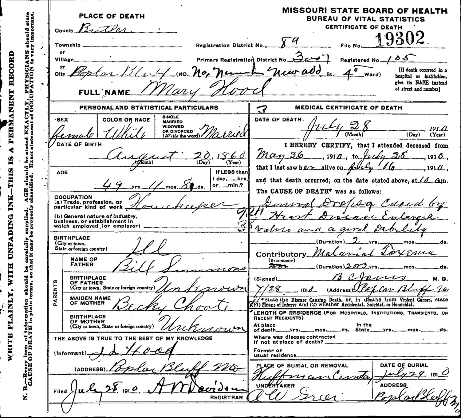July 28, 1910 in Poplar Bluff, Missouri