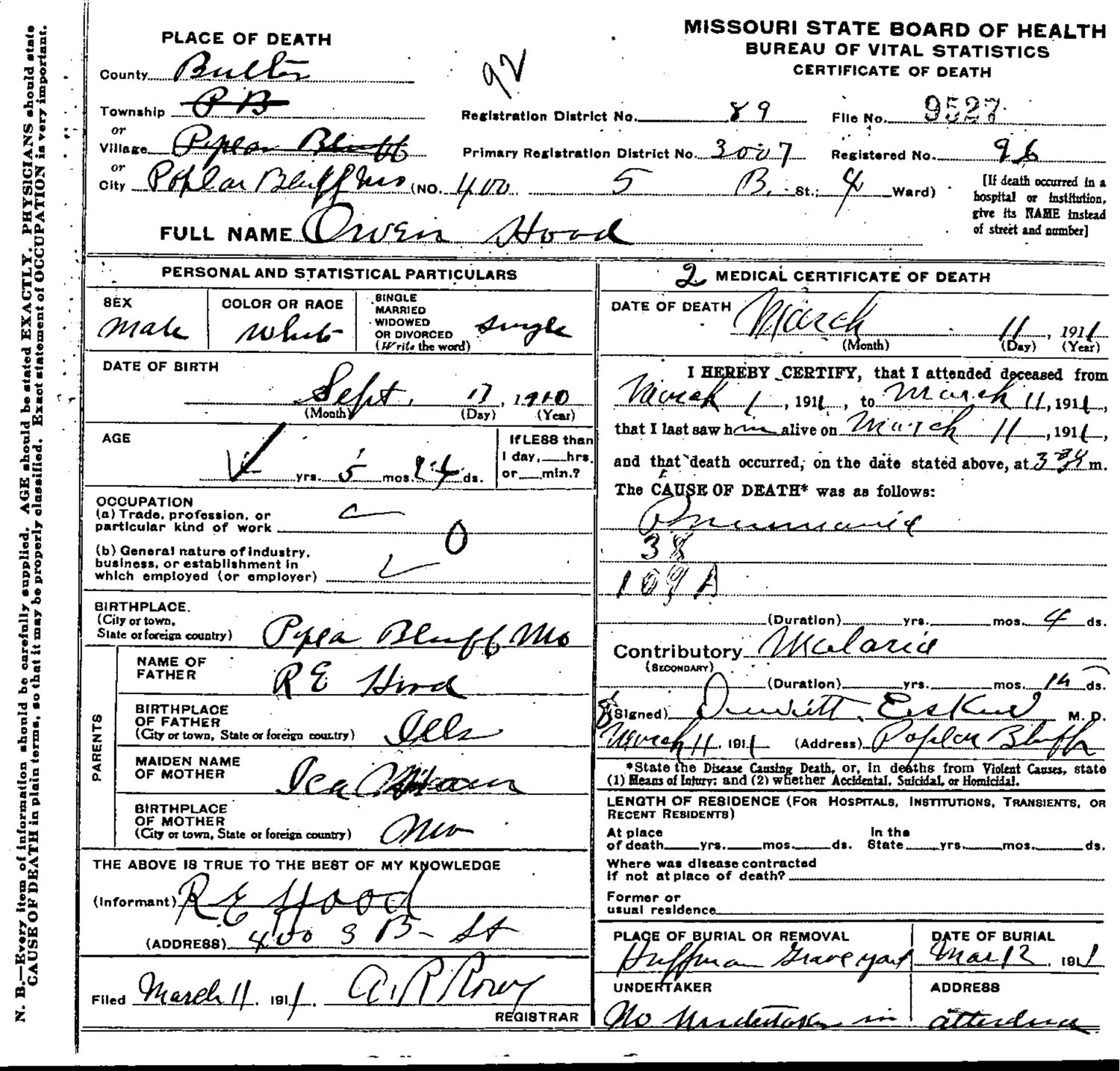 March 1911 in Poplar Bluff, Missouri; 400 S. 13th Street