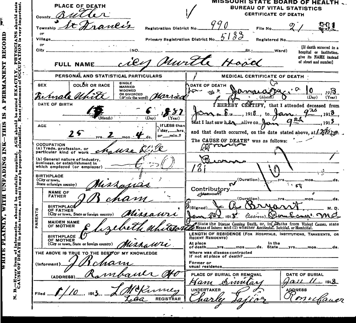 January 11, 1913 in St Francois, Missouri; Hamtown Cemetery