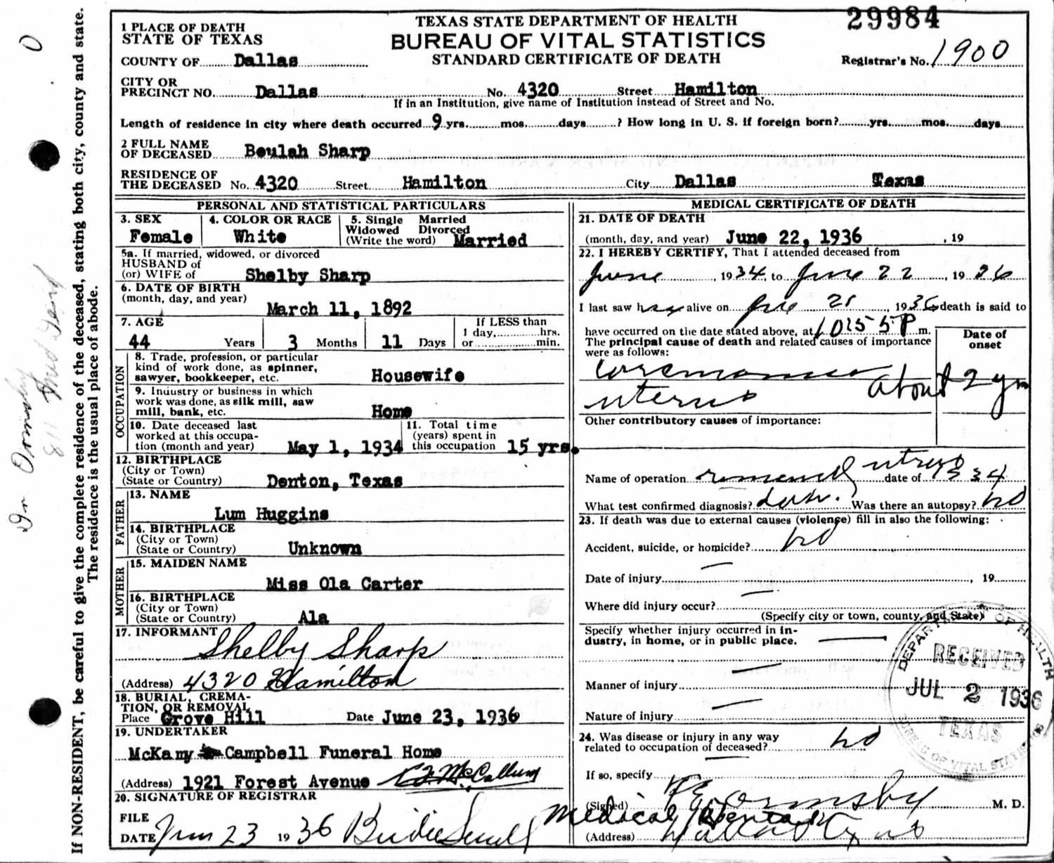 June 1936 in Dallas, Texas; 4320 Hamilton