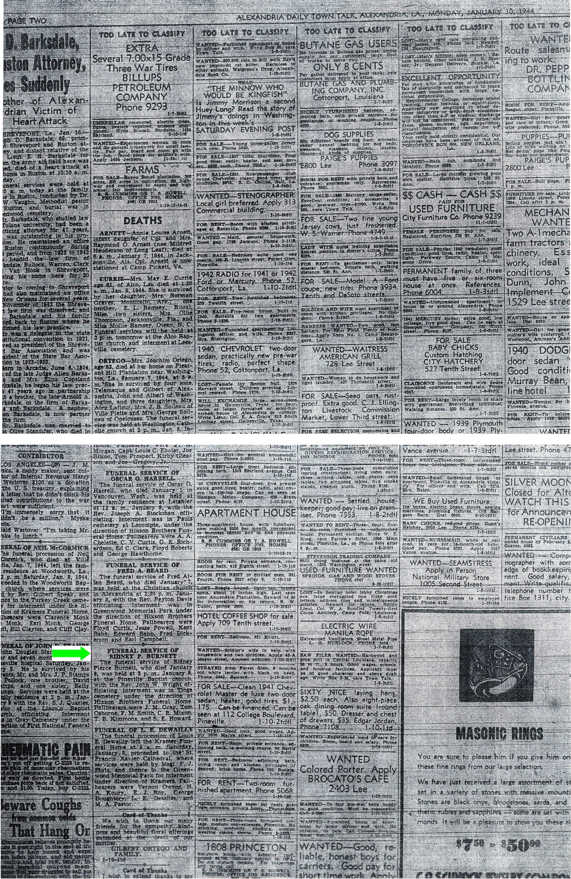 January 09, 1944 in Alexandria, Louisiana; Pineville Baptist Church - Hixson Brothers Funeral Home