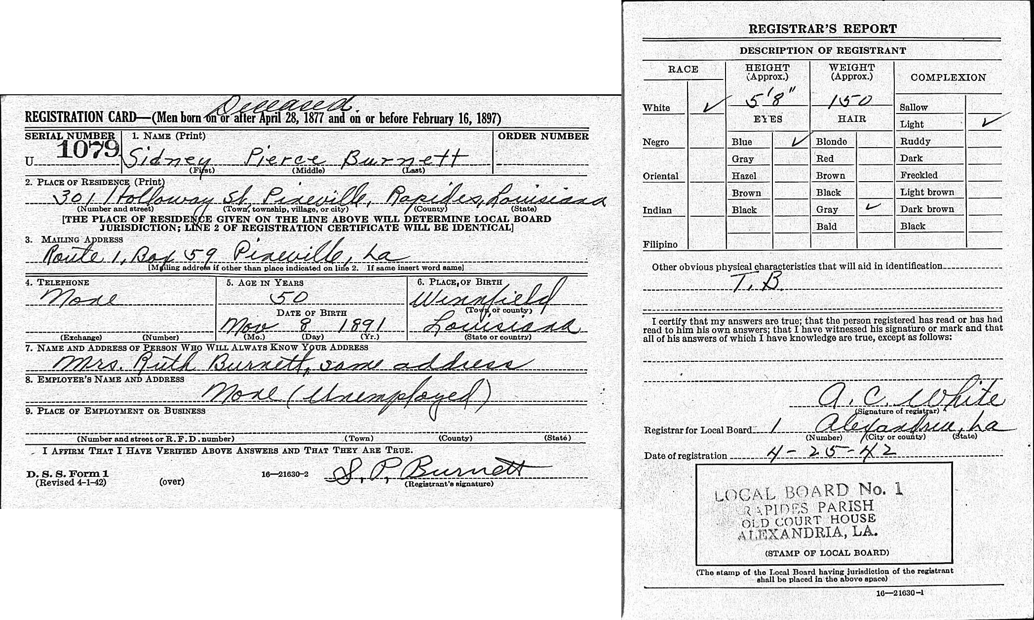 June 1917 in Woodworth, Louisiana; Saw Mill Laborer - Alexandria Lumber and Supply Company