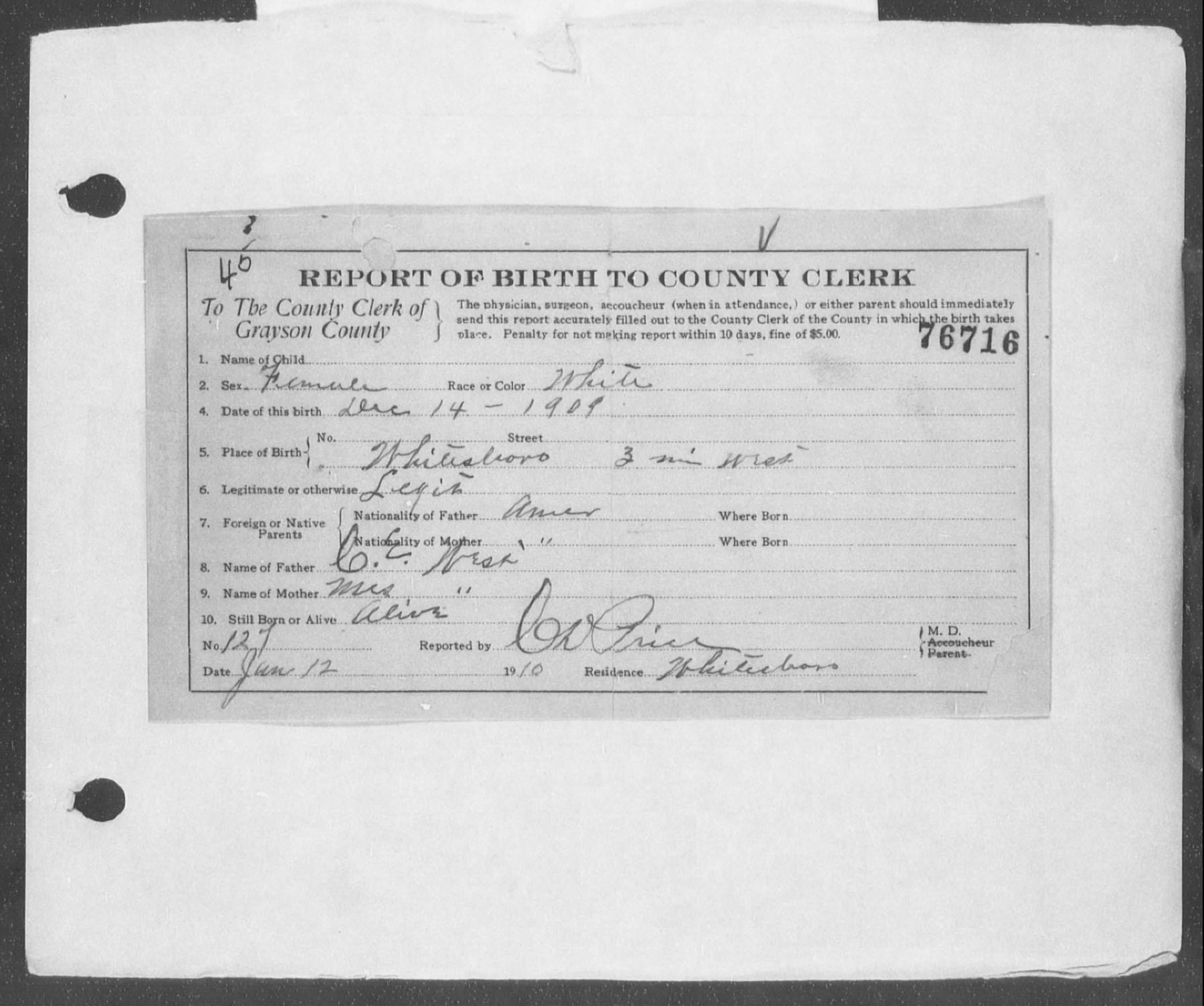 December 1909 in Whitesboro, Texas; 3 miles west of town