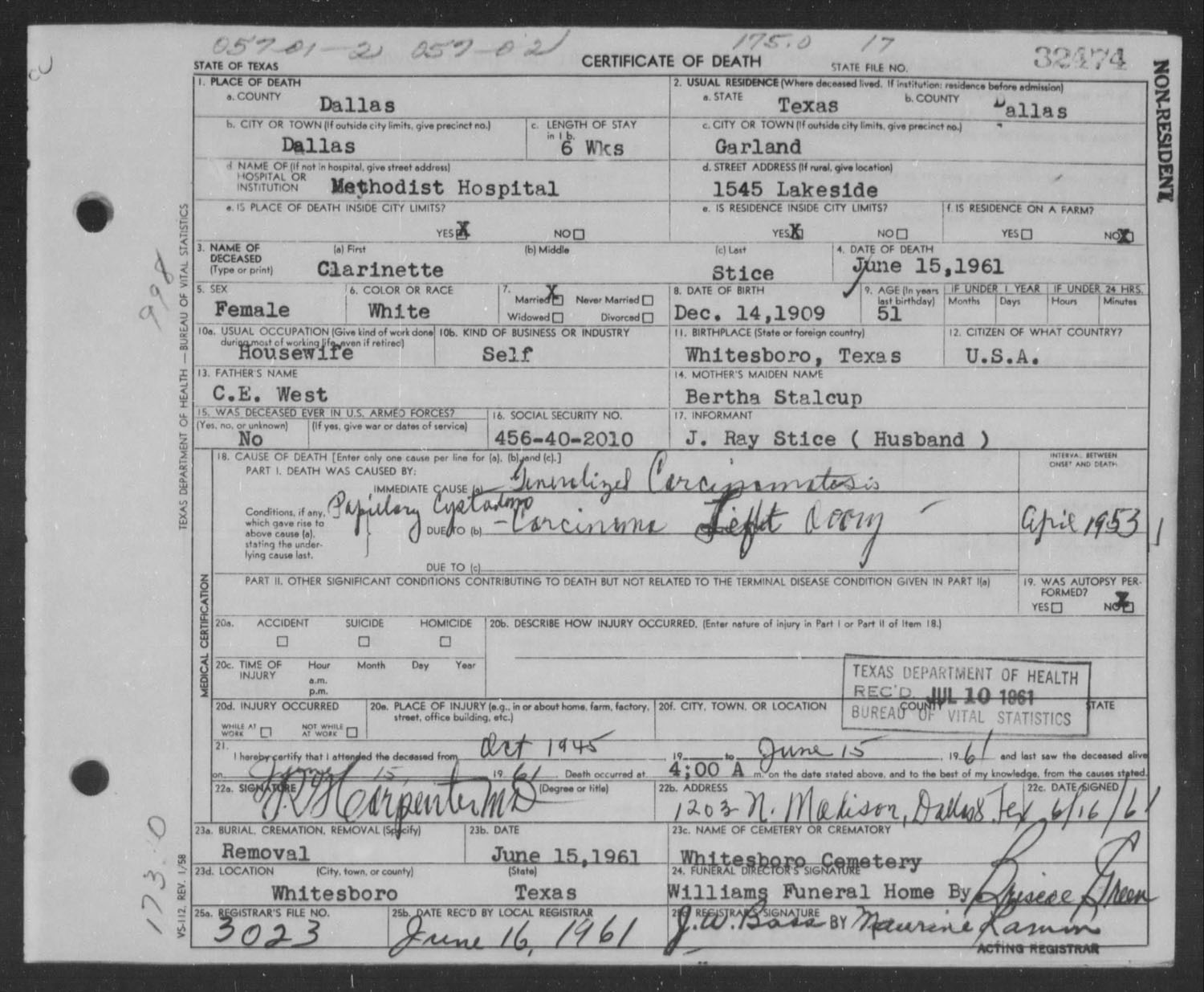 June 25, 1964 in Whitesboro, Texas; Oak Wood Cemetery