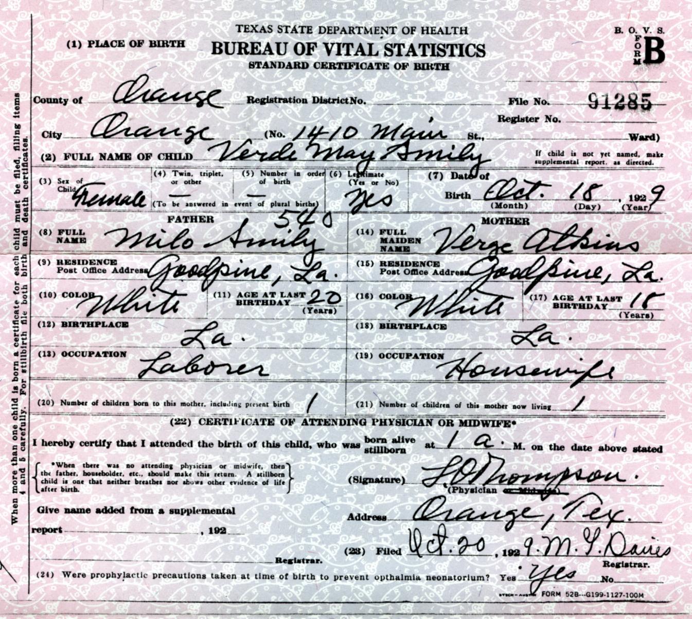 Details: 1929 - Texas, Orange, Orange - Atkins, Vertie Mae (Delayed)
