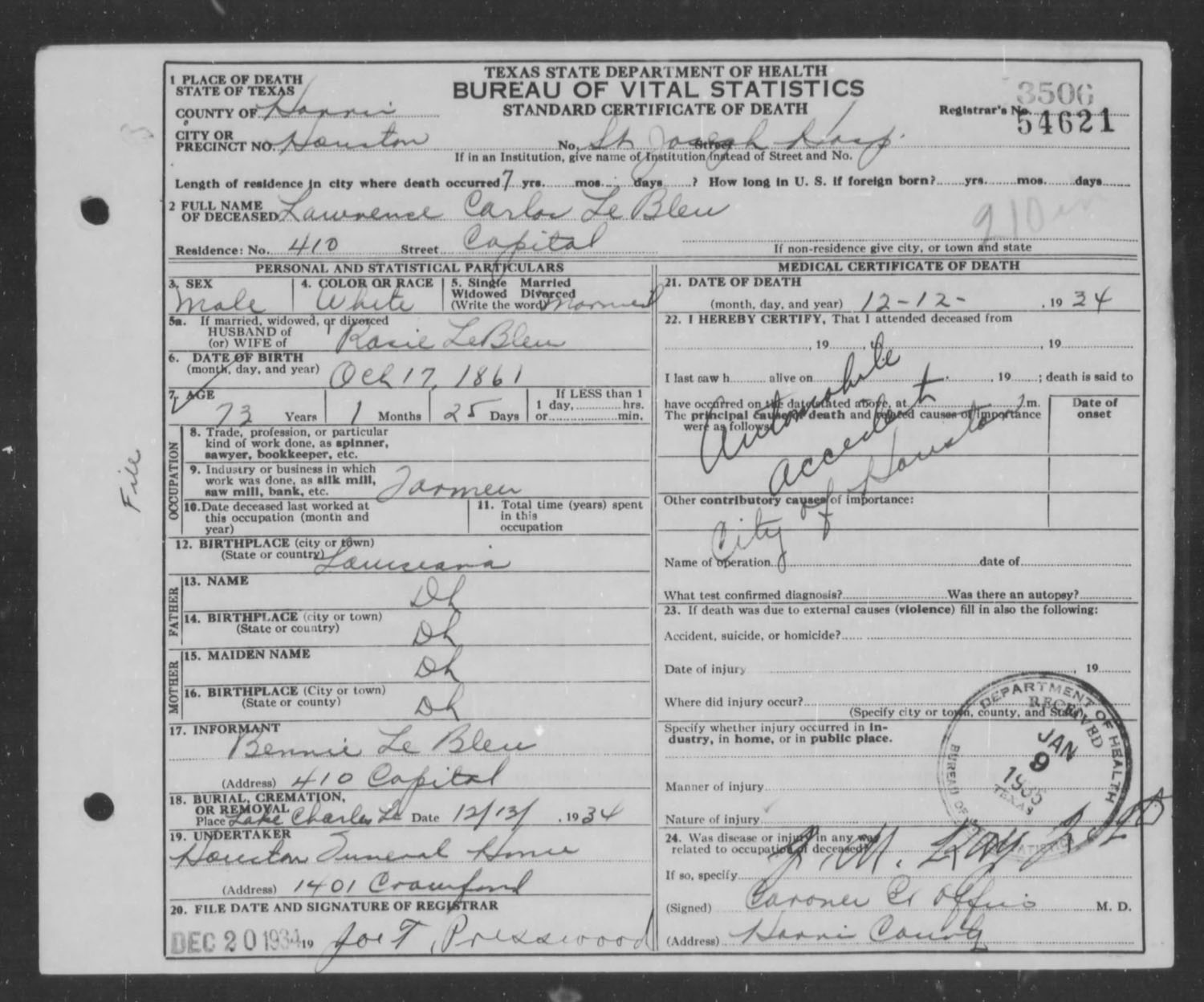 Lawerence Carlos LeBleu (1861 - 1934)