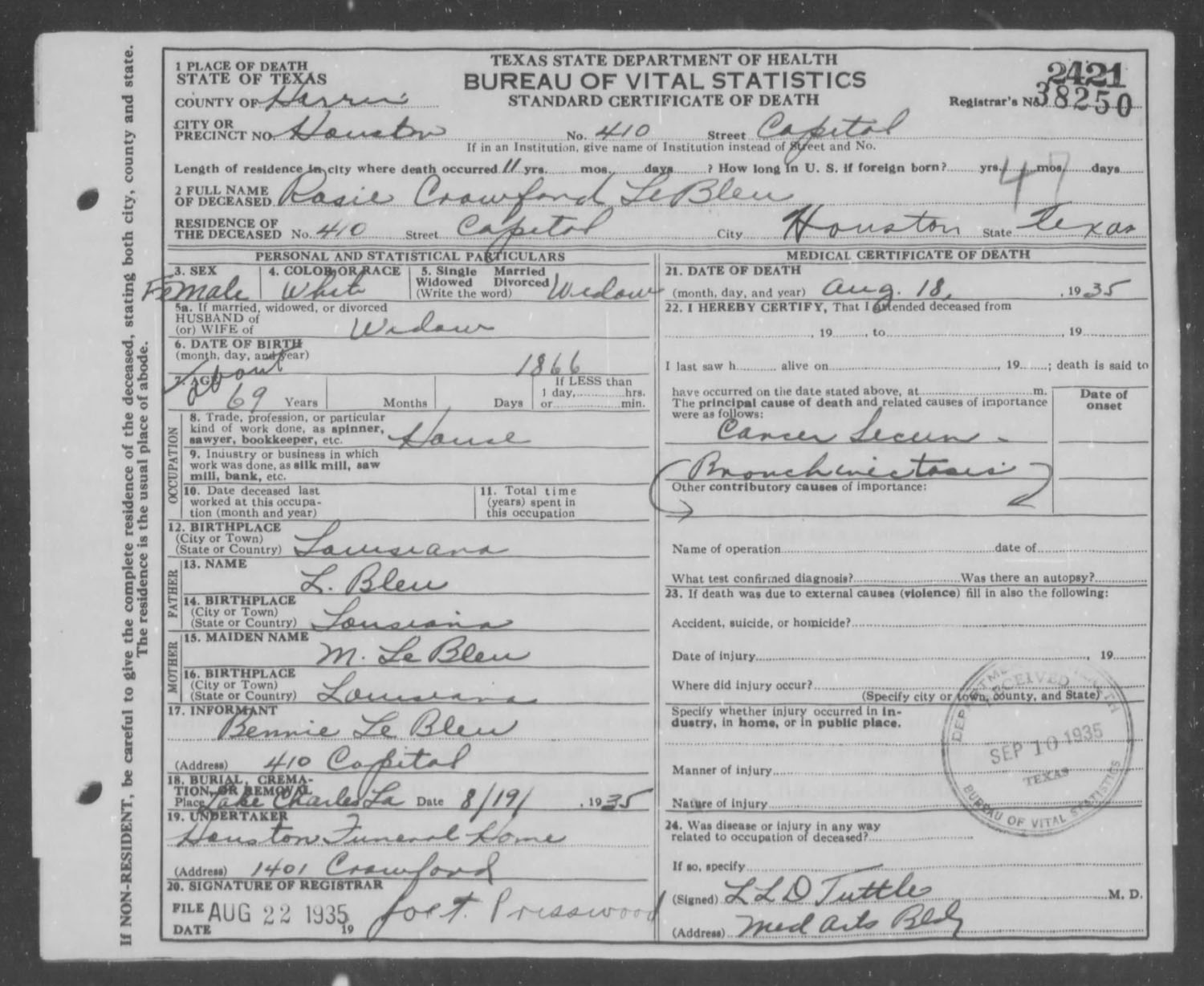 August 18, 1935 in Houston, Texas; At home - 410 Capital