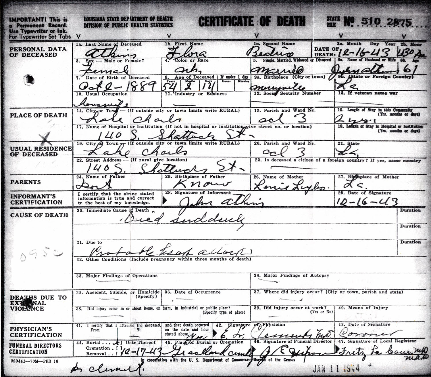 December 1943 in Lake Charles, Louisiana; 140 South Shattuck Street
