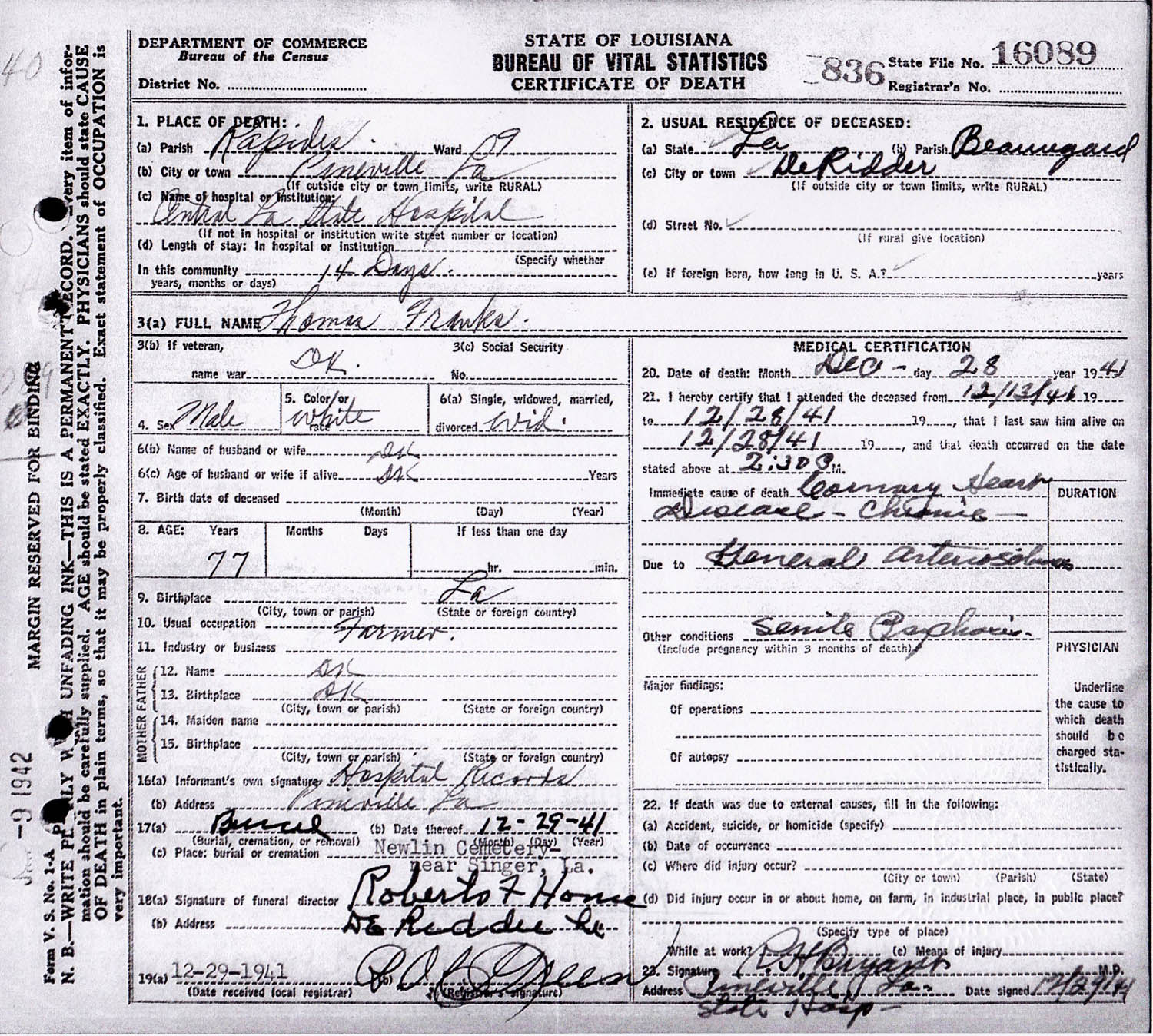 December 28, 1941 in Pineville, Louisiana; Central Louisiana State Hospital