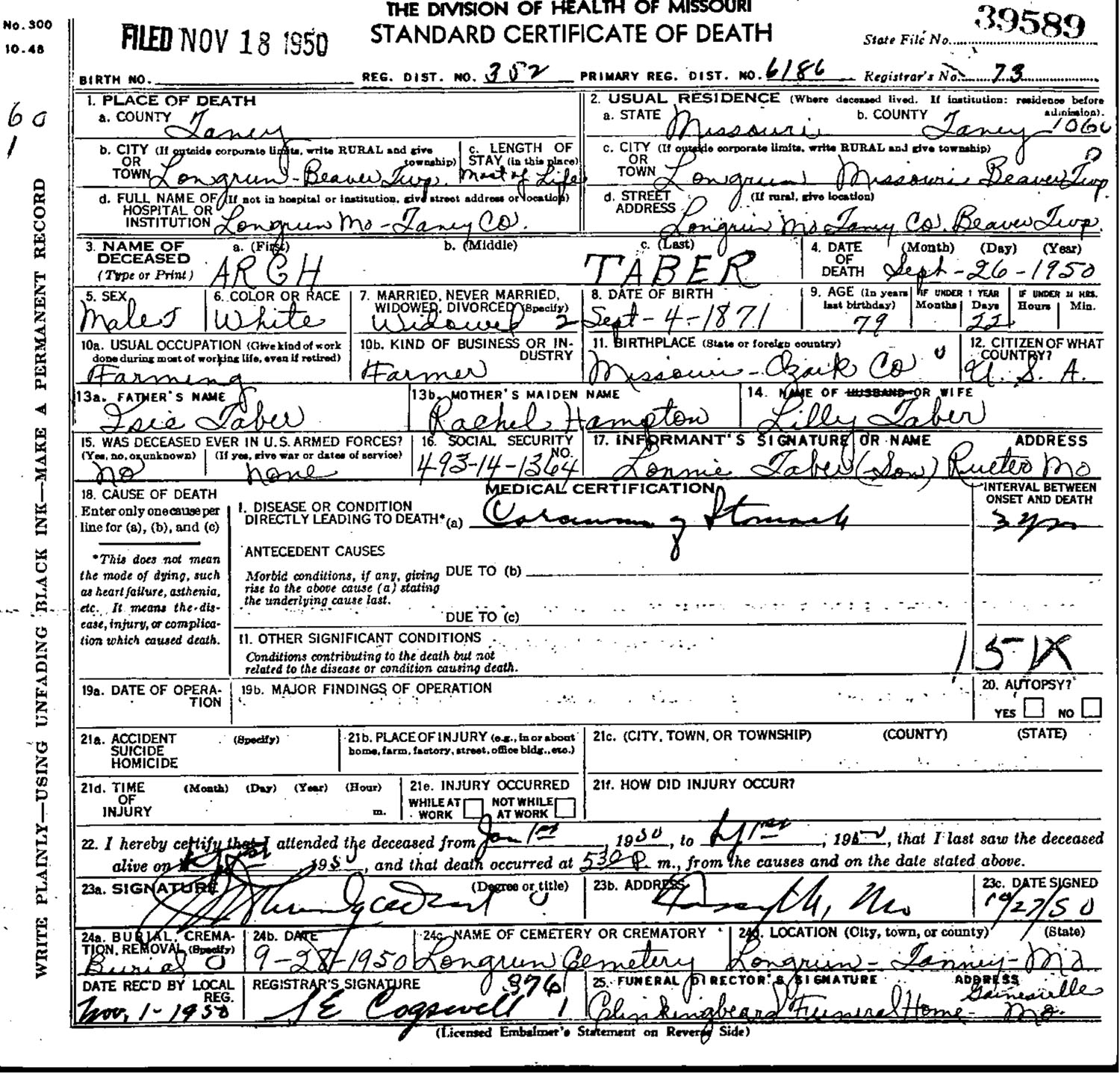 November 22, 1917 in Taney Co., Missouri