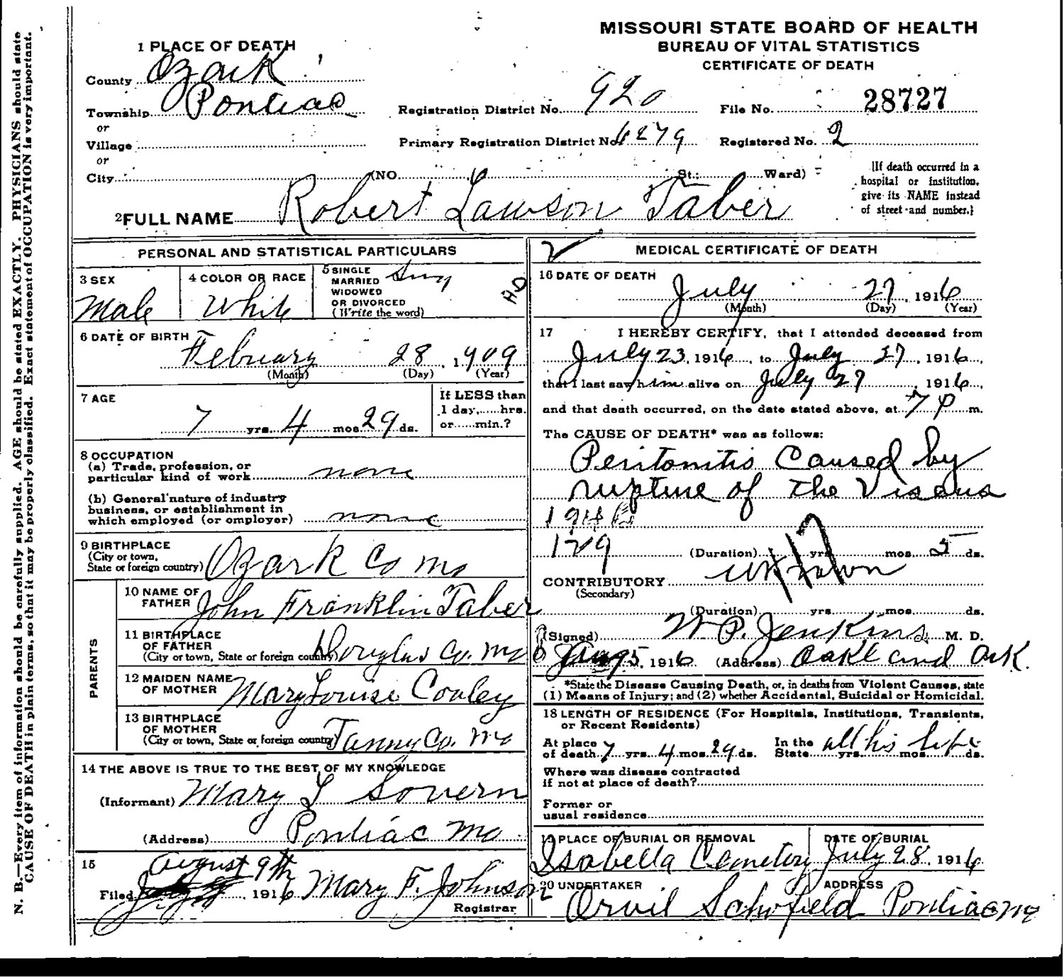 January 14, 1913 in Isabella, Missouri; Isabella Cemetery