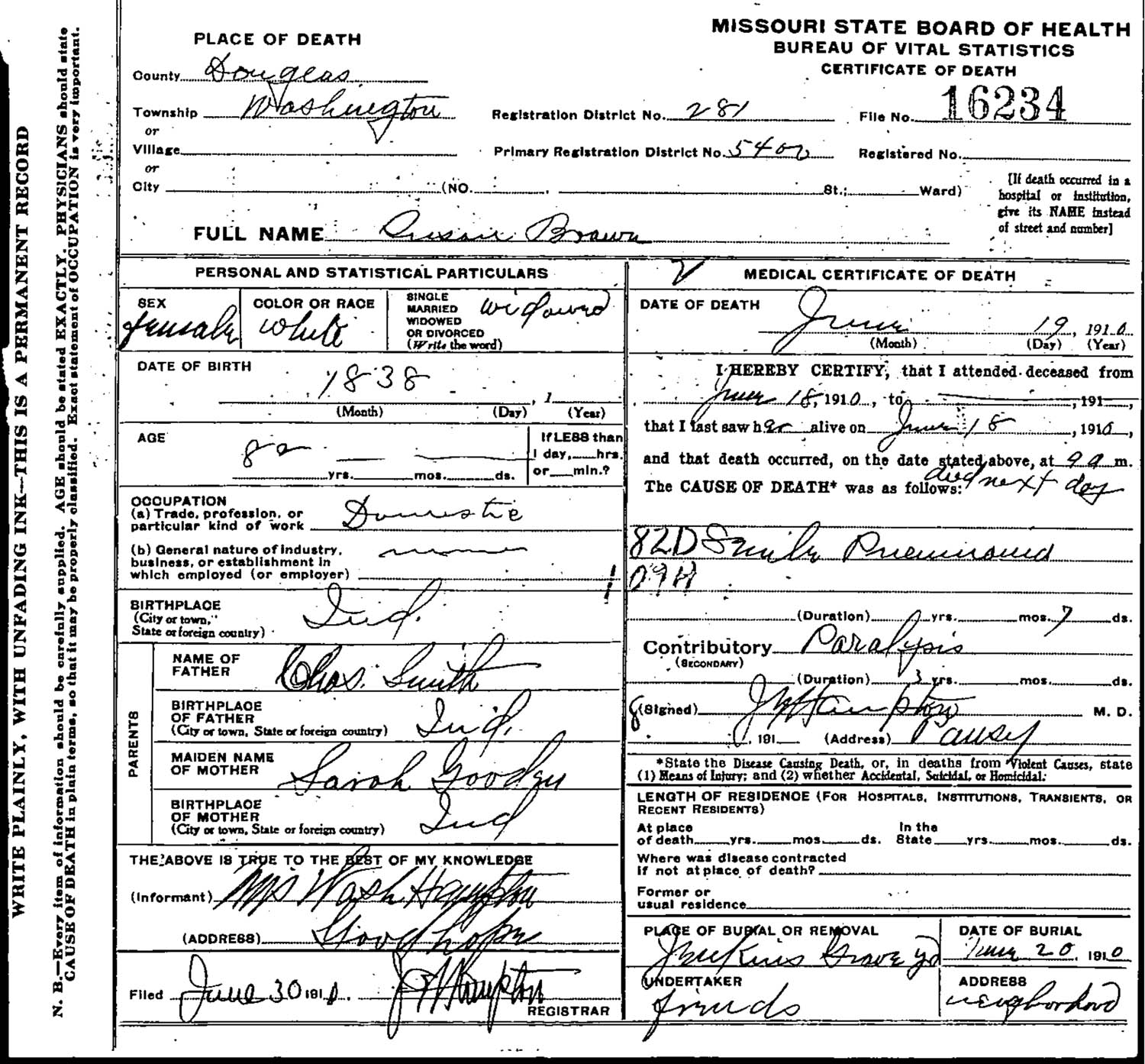 June 20, 1910 in Goodhope, Missouri; Jenkins Cemetery