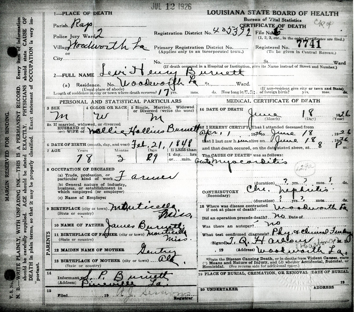 June 18, 1926 in Woodworth, Louisiana