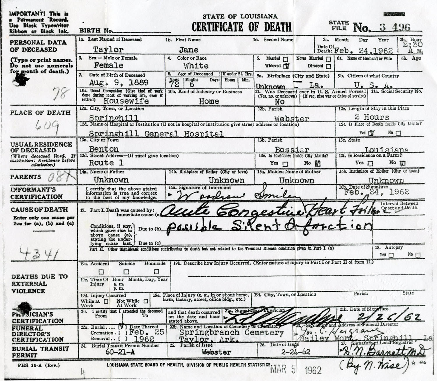February 25, 1962 in Taylor, Arkansas; Spring Branch Cemetery