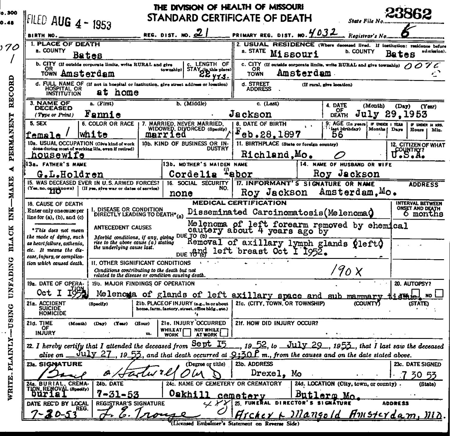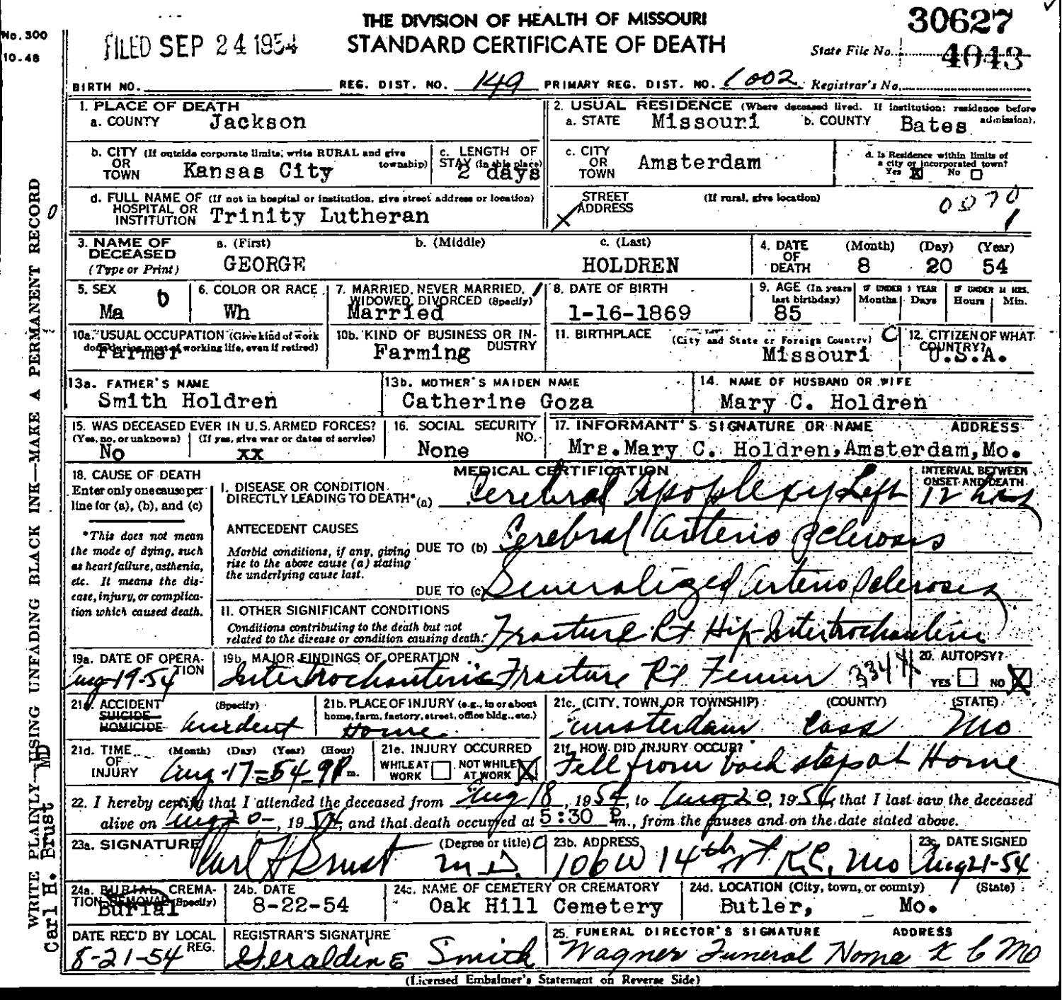 April 18, 1957 in Butler, Missouri; Oak Hill Cemetery - a.k.a. Bulter Cemetery