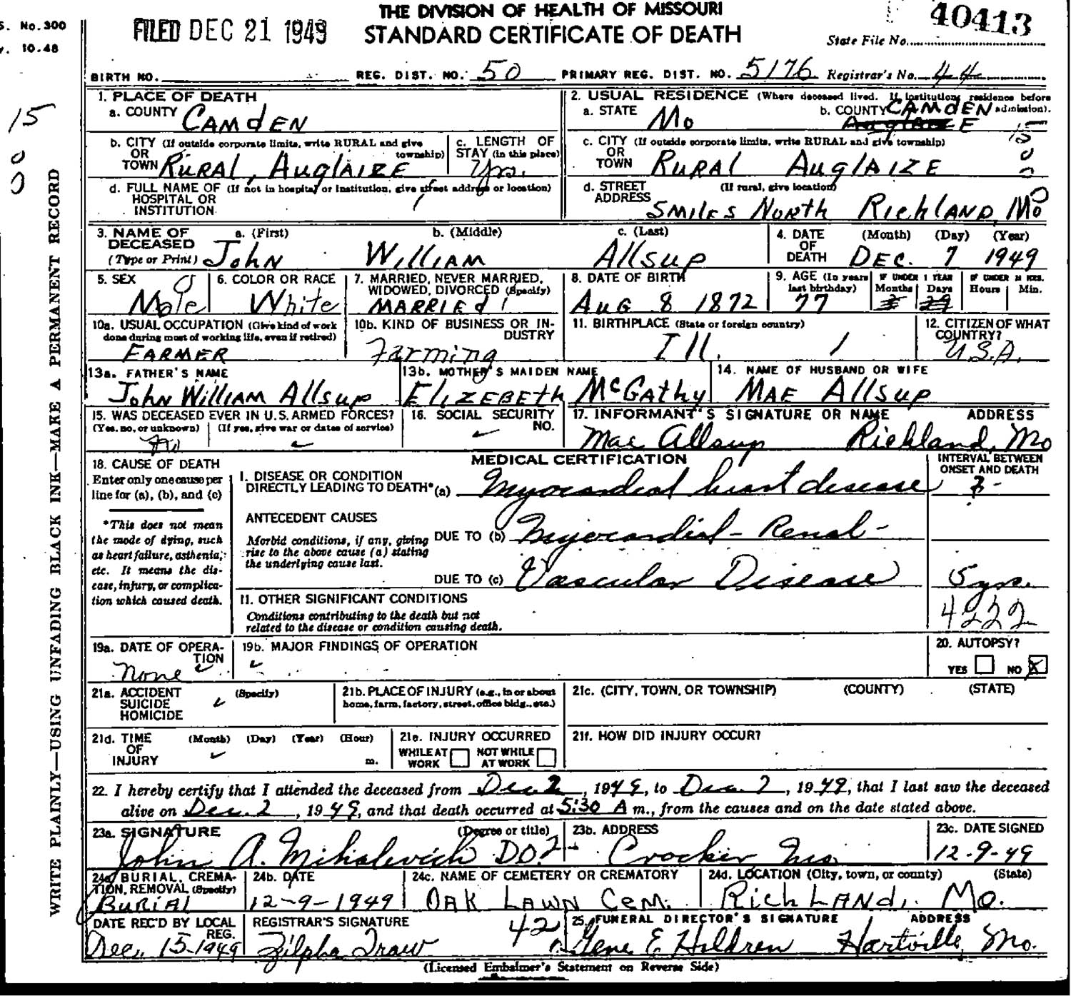 December 1949 in Auglaize, Missouri; 5 miles north of Richland, Missouri
