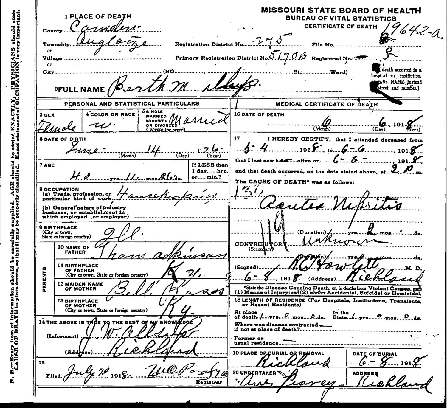 June 08, 1918 in Richland, Missouri; Oaklawn Cemetery
