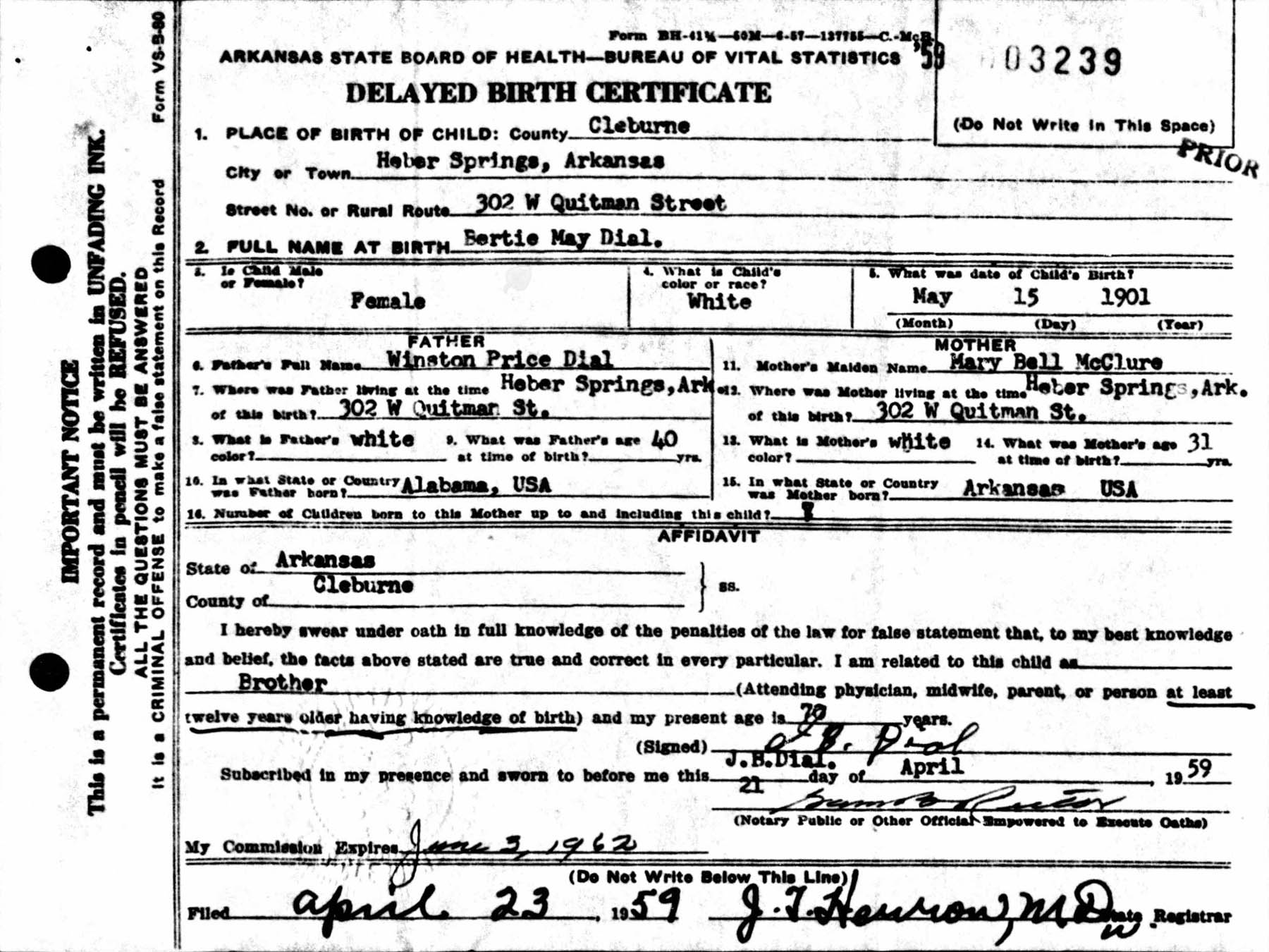 May 1901 in Heber Springs, Arkansas; 302 W Quitman Street