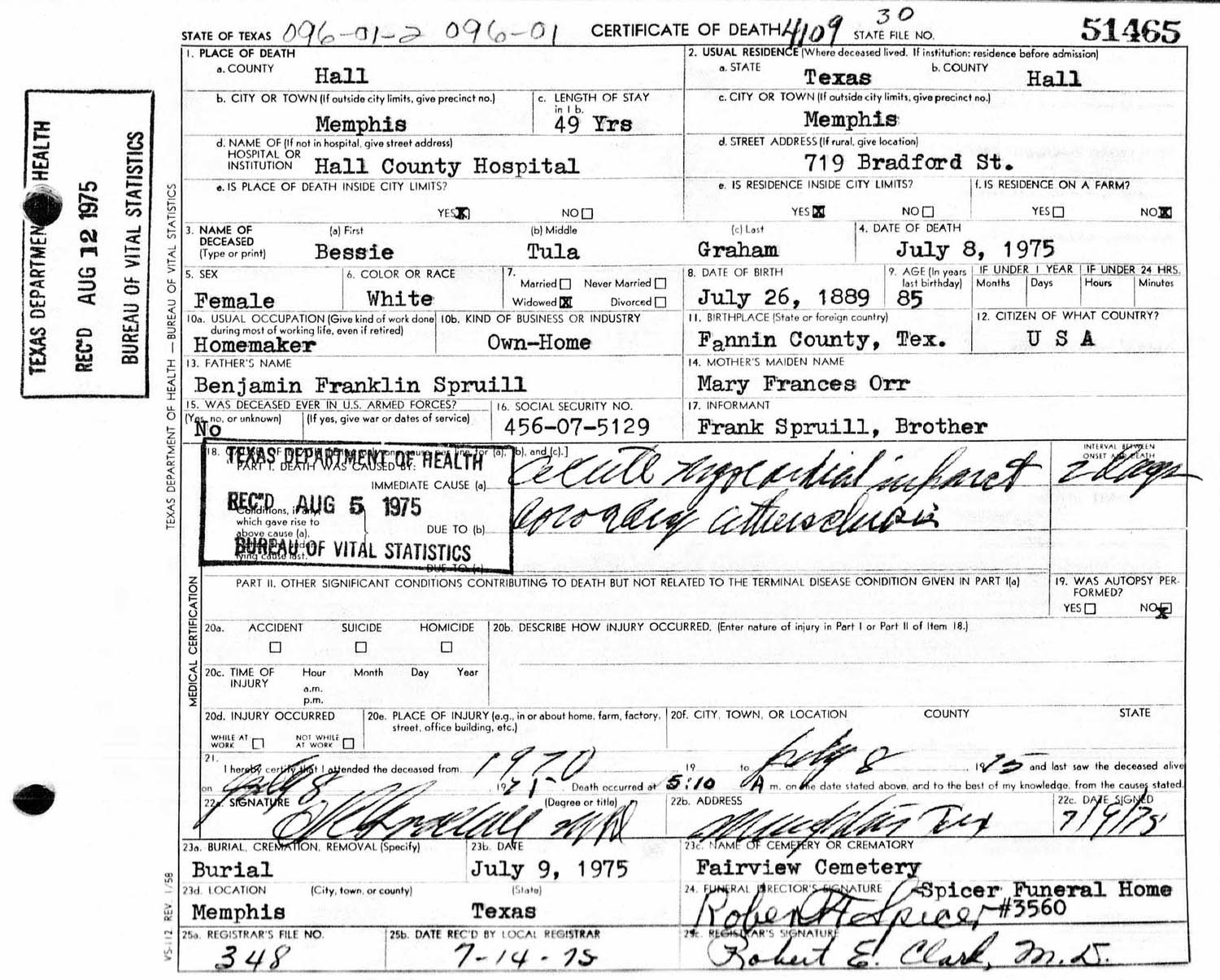 July 09, 1975 in Memphis, Texas; Spicer Funeral Home