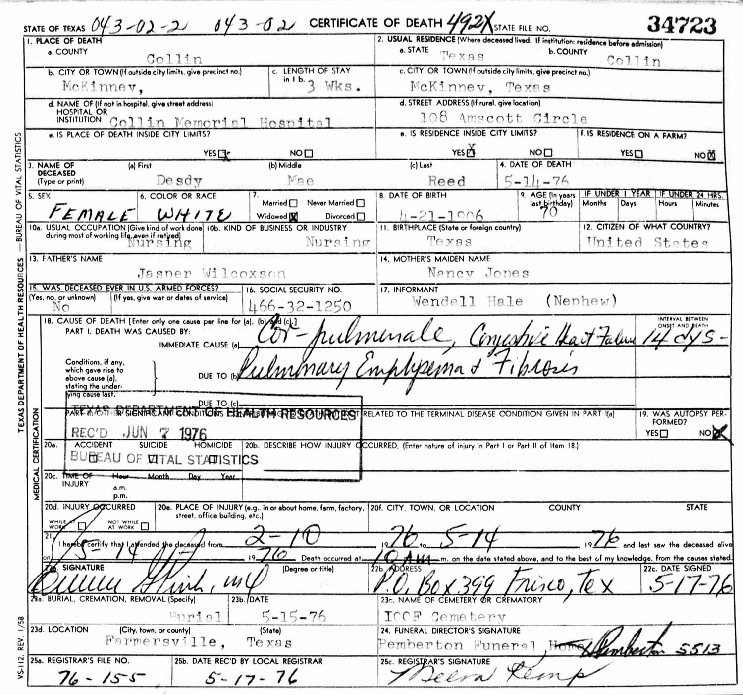 May 15, 1976 in Farmersville, Texas; IOOF Cemetery