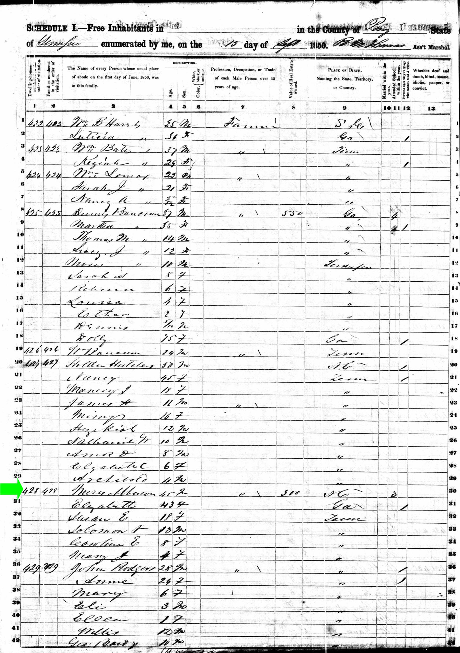 Sepember 1850 in Perry Co., Tennessee