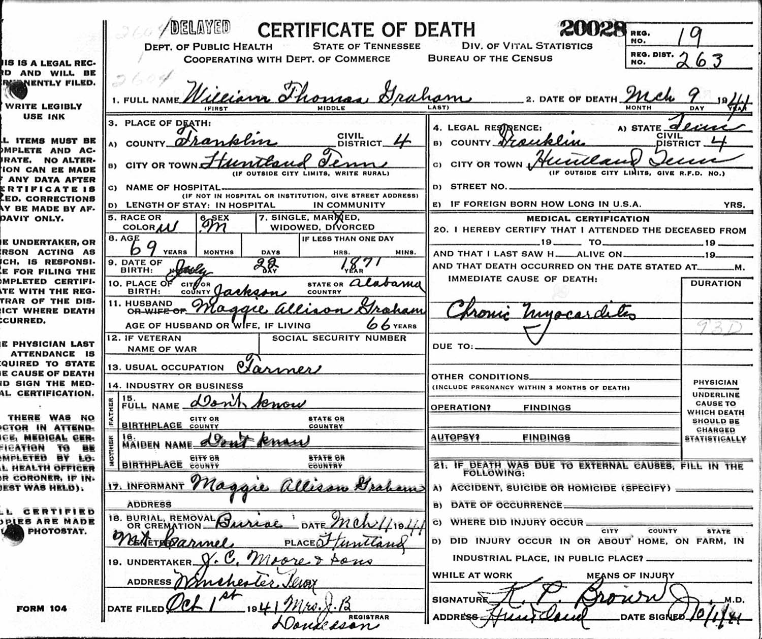 March 11, 1941 in Huntland, Tennessee; Mount Carmel Cemetery