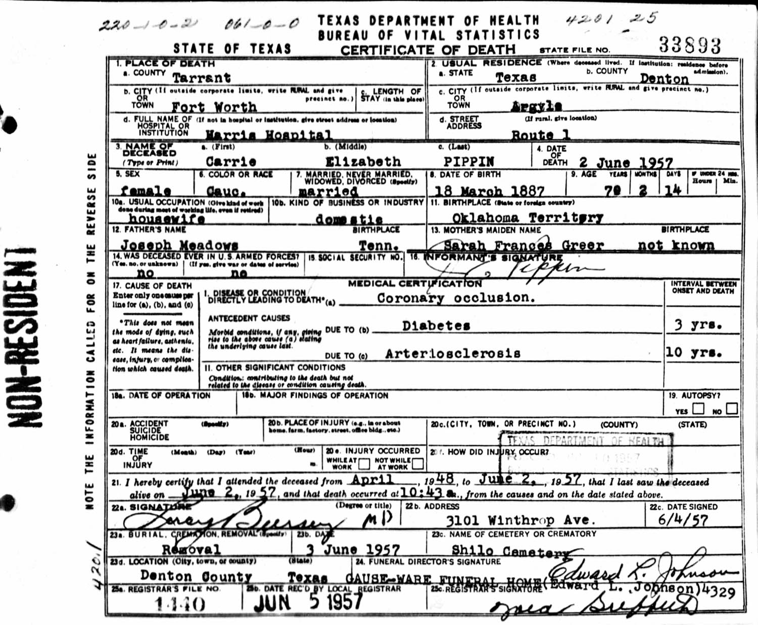 June 03, 1957 in Denton Co., Texas; Gause-Ware Funeral Home