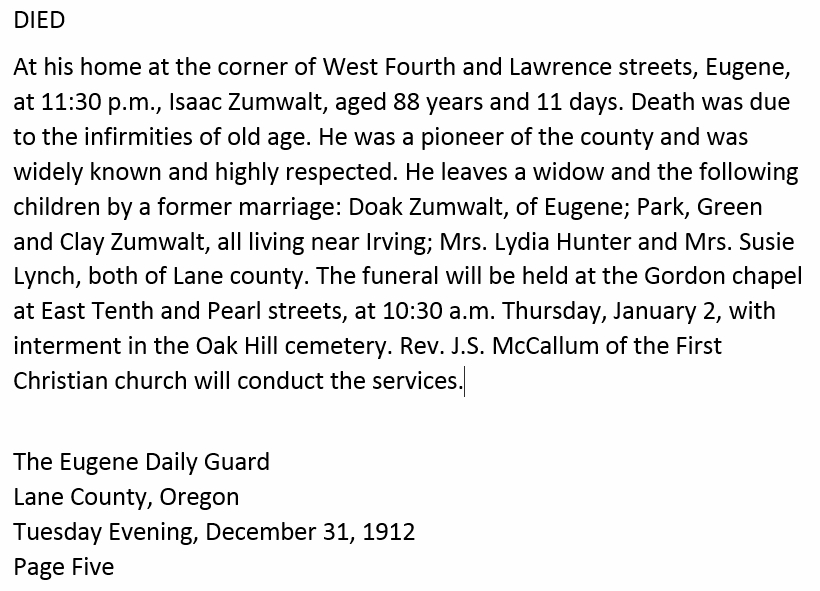 January 02, 1913 in Eugene, Oregon; Oak Hill Cemetery