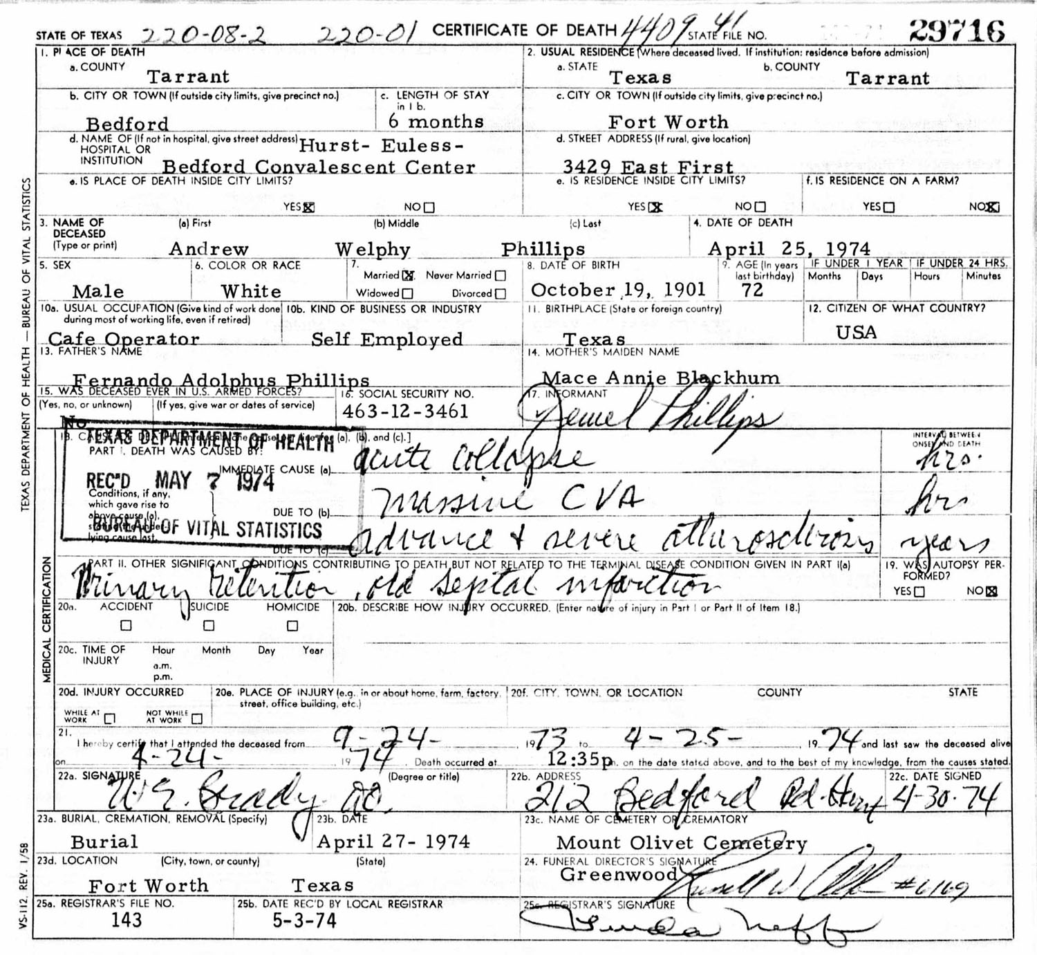 April 27, 1974 in Fort Worth, Texas; Mount Olivet Cemetery