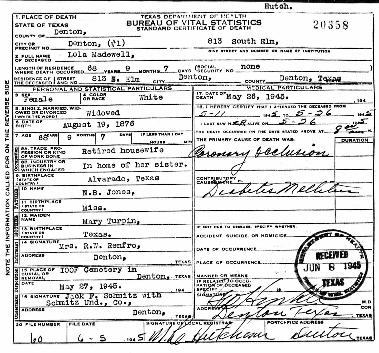 May 26, 1945 in Denton, Texas; 813 South Elm