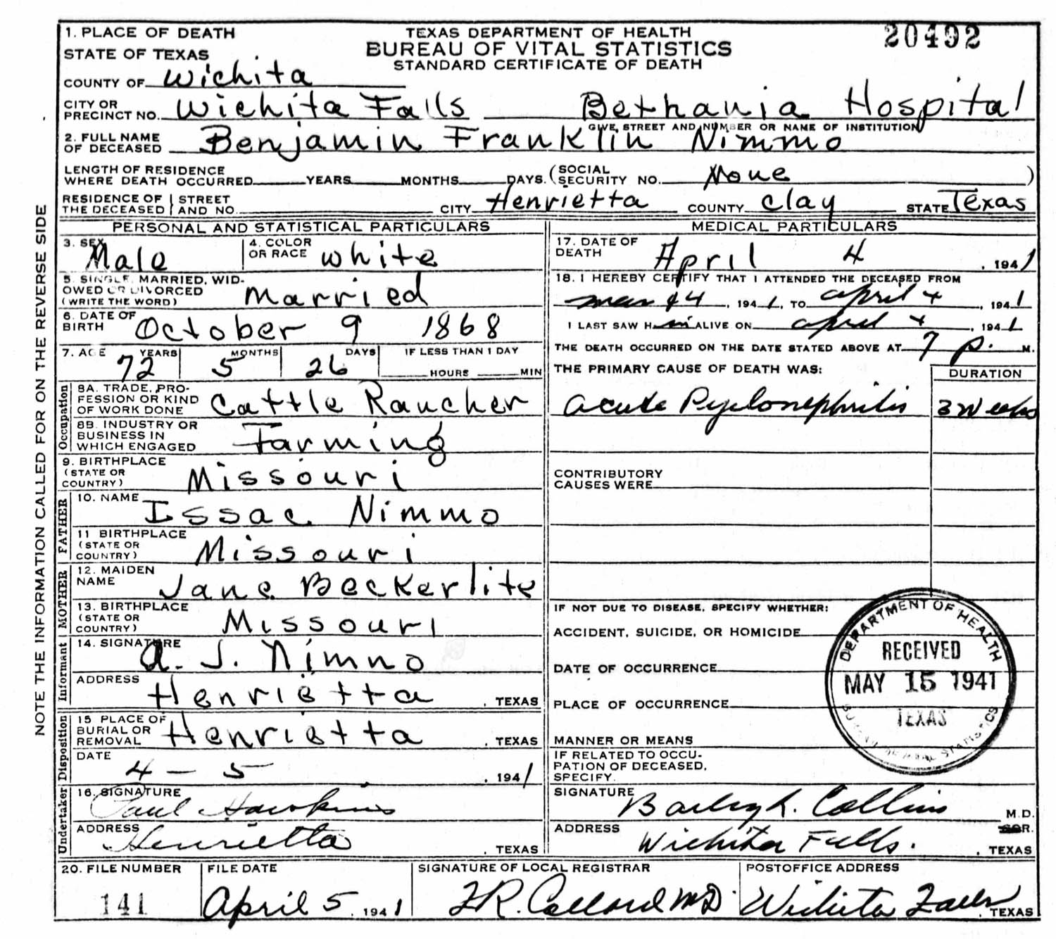 April 1941 in Henrietta, Texas; Hope Cemetery