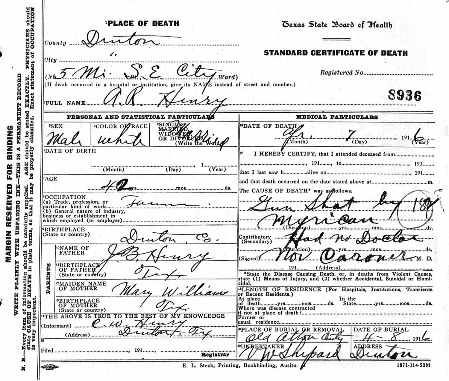 April 07, 1916 in Denton Co., Texas; 5 miles southeast of city