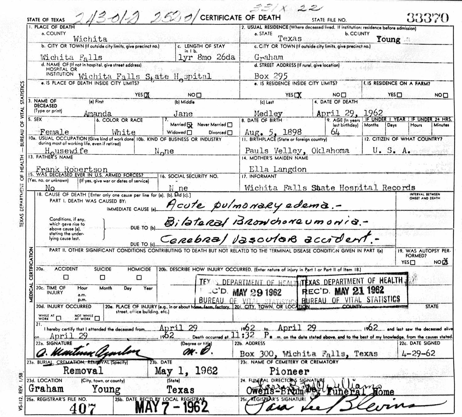 April 29, 1962 in Wichita Falls, Texas; Wichita Falls State Hospital