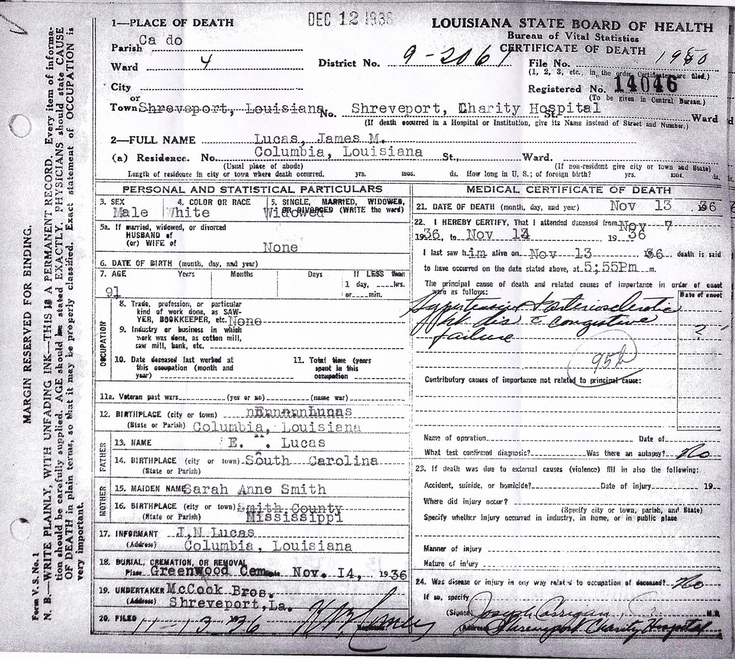 November 14, 1936 in Shreveport, Louisiana; Greenwood Cemetery
